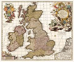 Druckplatte von Nicolm. Visscher Herausgegeben: Peter Schenk. Britischen Inseln, nach 1717. Außenformat (Breite x Höhe) 66 x 56 cm - Darstellungsgröße (Breite x Höhe) 61,8 x 52 cm. Grenz-und flächenkolorierte Karte. Reprint. --- Eine sehr schöne Karte der Brit...