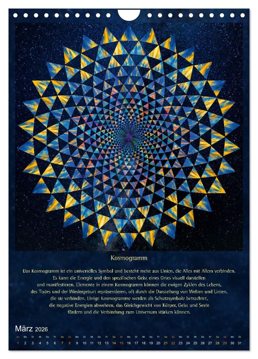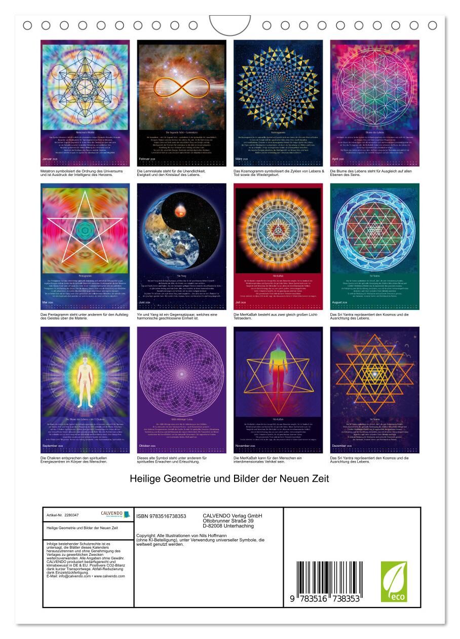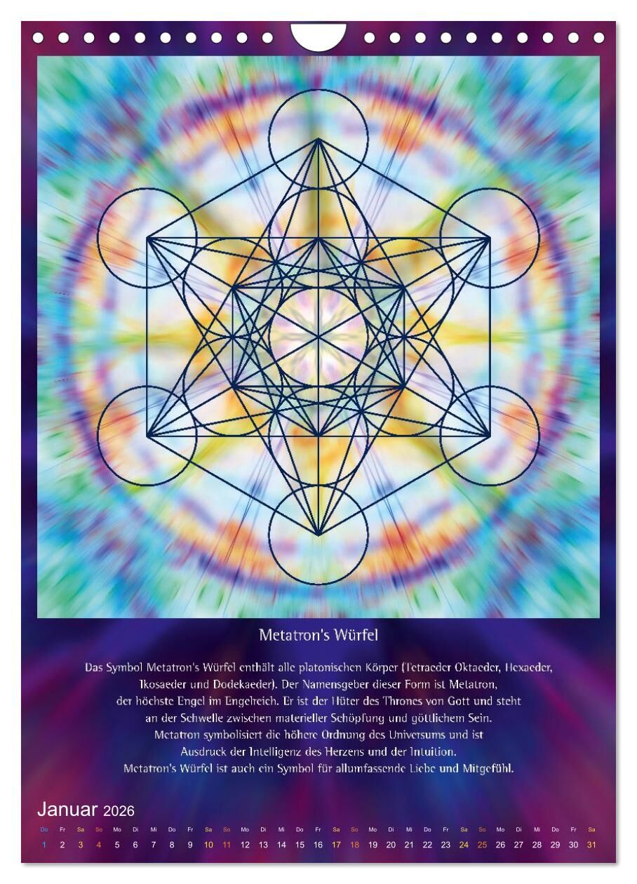 Dieser Kalender vereint universelle Symbole, die eine uralte, im Glauben an Gott oder eine höhere Macht tief verwurzelte Kraft haben. Heilige Geometrie kann dem Alltag eine Qualität der Ruhe und der tiefgreifenden Wandlung verleihen. Diese Bilder sind, aufgrun...