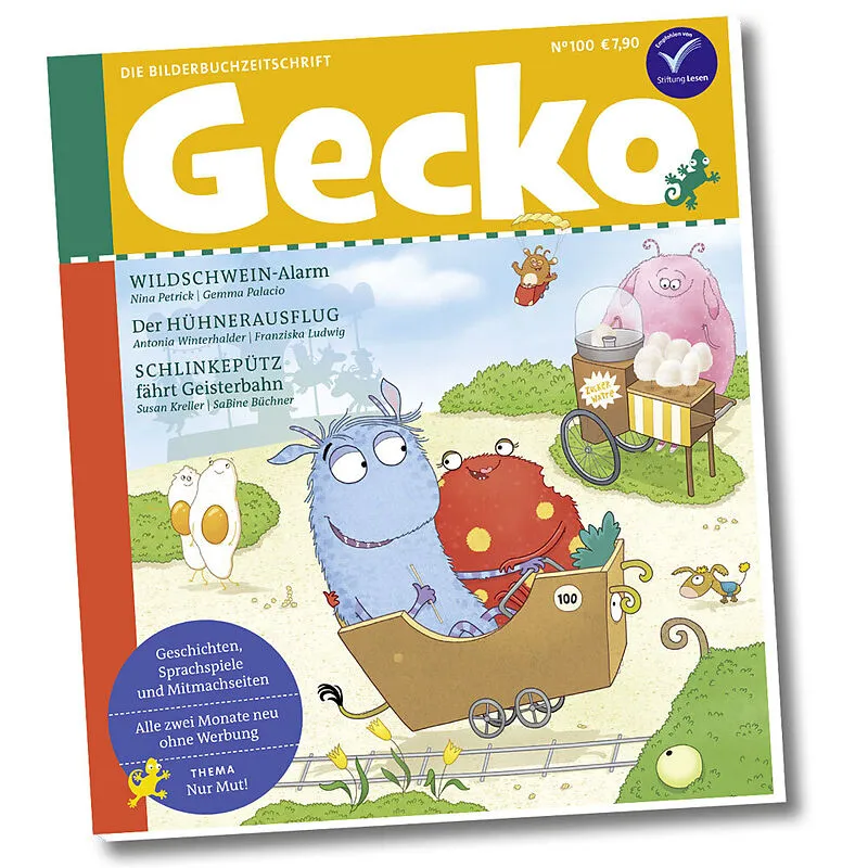 Nur Mut! Gecko feiert die hundertste Ausgabe mit neuen bunten Geschichten rund ums mutig sein und sich was (zu-)trauen. Unser Lieblingsmonster Schlinkeputz wagt sich in die Geisterbahn und lernt entsetzliche Ängste, nicht nur vor Frotteespannbetttuchgespenster...Nur Mut! Gecko feiert die hundertste Ausgabe mit neuen bunten Geschichten rund ums mutig sein und sich was (zu-)trauen. Unser Lieblingsmonster Schlinkeputz wagt sich in die Geisterbahn und lernt entsetzliche Ängste, nicht nur vor Frotteespannbetttuchgespenstern, zu uberwinden. Susan Kreller und SaBine Buchner sind die wie immer genialen Urheberinnen der 10. Geschichte von Schlinkeputz & Co. ! Huhner und Hasen mutig? Ist der Hasenfuß nicht einer, der eher davonläuft als standzuhalten? Nicht so im »Huhnerausflug« von Antonia Winterhalder und Franziska Ludwig, wo Huhner zu entschlossenen Entdeckerinnen werden und ein Hase zum flinken Helden. Picknick mit Wildschweinen, das kann eine schöne Sauerei werden, und ganz ungefährlich ist es auch nicht. Wie Karl, Merle und Oma Gerdi den Schrecken parieren, beleuchtet in »Wildschweinalarm« Nina Petrick, illustriert von Gemma Palacio. Naturlich durfen in der Jubiläumsausgabe die Rubriken nicht fehlen, deren Schöpferinnen von Ausgabe zu Ausgabe mit sprach- und bildspielerischen Ideen aufwarten: Der Wortsport mit Bild-Reim-Rätseln von Stefanie Duckstein, Fremdwörter von Bettina Bexte, das ABC der Tunwörter von Ina Hattenhauer, diesmal mit s wie sammeln. Im LiLabor gibt es ein Alltags-Experiment: prickelnde Limonade selbst herstellen und dabei die leckerste Mischung erforschen! Viel Spaß beim Vorlesen und ersten Selberlesen! 52 bunte Seiten zum Vor- und Selberlesen für neugierige Kinder ab 4 und ihre Erwachsenen. Die Geschichten: »Wildschweinalarm« von Nina Petrick und Gemma Palacio »Der Hühnerausflug« von Antonia Winterhalder und Franziska Ludwig »Schlinkepütz fährt Geisterbahn« von Susan Kreller und SaBine Buchner Alle Künstlerinnen und Künstler dieser Gecko-Ausgabe: Nina Petrick, Gemma Palacio, Antonia Winterhalder, Franziska Ludwig, Stefanie Duckstein, Susan Kreller, SaBine Buchner, Stiftung Kinder forschen, Katrin Wiegand, Ina Hattenhauer, Mascha Greune, Christine Paxmann, Katja Mensing, Bettina Bexte, Ina Nefzer Gecko 100 erscheint am 1. März 2024 ISBN 978-3-940675-99-6 - - - - - - - - - - - - - - - - - - - - - - - - - - - - - - - - - - - - - - - - - - - - - - - - - - - - Gecko ist eine werbefreie Bilderbuch-Zeitschrift für neugierige Kindergartenkinder ab 4 Jahren und Grundschulkinder. Jede Ausgabe ist voll mit neuen spannenden Geschichten zum Vorlesen und Selberlesen und eigens für Gecko illustriert! Außerdem gibt es Wortspiele, Mitmachseiten, Buchtipps, Rätsel, Bastelideen, Gedichte, ein Experiment und vieles mehr. Alle Geschichten haben die ideale Länge für Gutenachtgeschichten. Gecko wurde mit dem Qualitätssiegel der Stiftung Lesen ausgezeichnet. Gecko gibt es auch als Abonnement: Alle Eltern, Großeltern, Tanten und Onkel können ihren Kindern ein Jahr Vorlesespaß und gemeinsame Zeit schenken. Alle zwei Monate freuen sich die kleinen Abonnenten auf eigene Post. Auf www.gecko-kinderzeitschrift.de und in jeder Buchhandlung.
