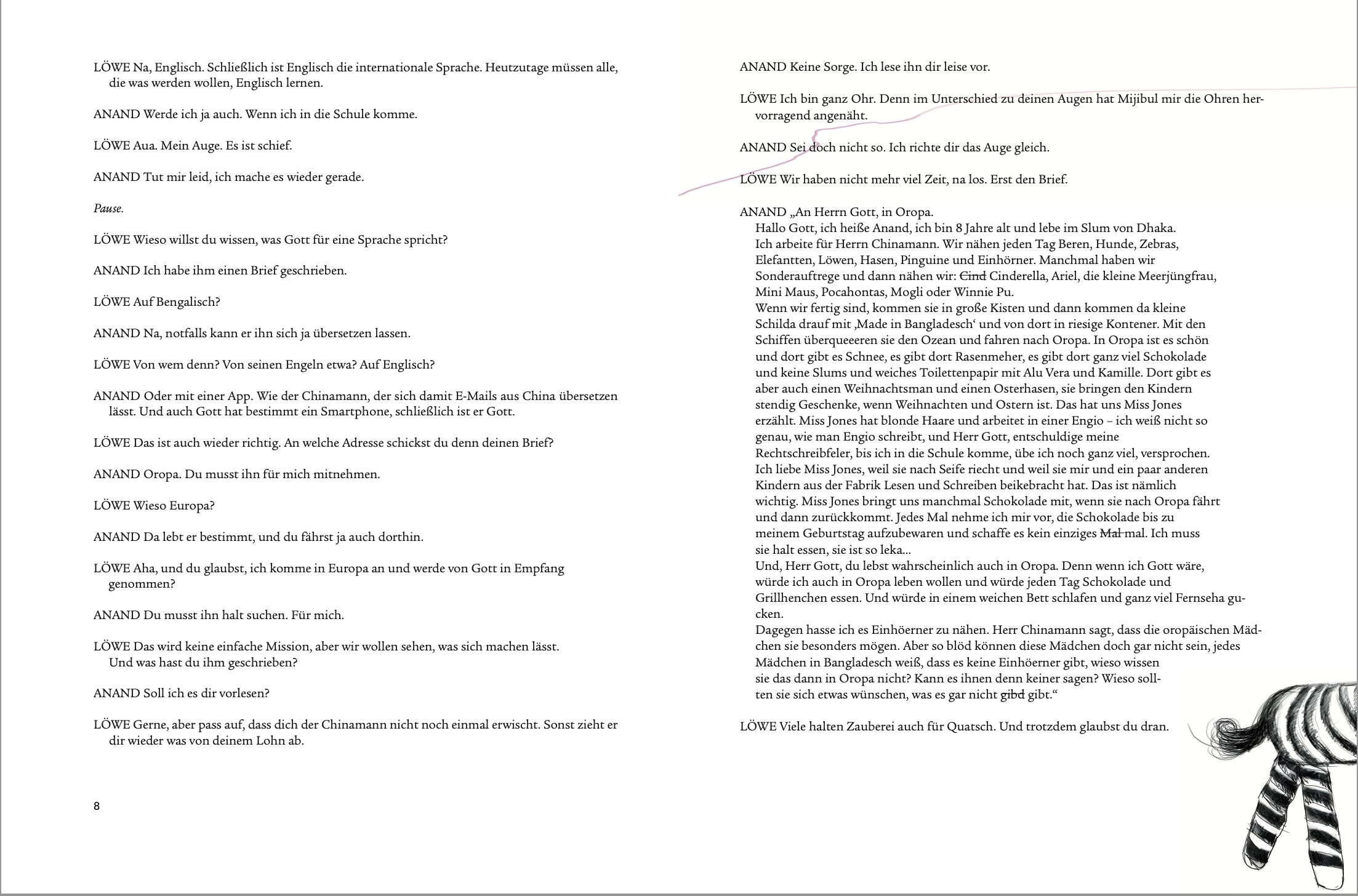 Mit Zylinder, Luftschlangen und goldenem Konfetti lässt der achtjährige Anand seinen Löwen unter tosendem Applaus durch brennende Reifen springen. Doch steht der junge Zauberer nicht in einer Zirkusarena, sondern muss für den Chinamann tagein, tagaus Plüschtiere in einer Fabrik in Bangladesch nähen und hat wegen seiner Zirkus-Träumerei einem Stofflöwen ein Auge schief angenäht. Aber für die Verwirklichung seines Zirkustraumes braucht er einen Plan. Schnell schreibt er eine Nachricht an »Gott in Europa« und versteckt diese im Bauch seines Löwen. Es ist der schönste und wichtigste Löwe, den er je genäht hat, denn er soll ihm, der keine Kindheit hat, und seiner Familie helfen, ihn zur Schule zu schicken. Der Löwe mit dem schiefen Auge ist auf dem Weg nach Europa mit einer wichtigen Mission: Er soll Anands Brief Gott überbringen. Auf seiner abenteuerlichen Reise kommt der Löwe zuerst nach Deutschland, landet bei der kleinen Emma, die am Weihnachtsabend beschließt, ihre ganzen Besitztümer an arme Kinder im Senegal zu verschenken. Im Senegal findet ihn das arme Mädchen Zula, von ihr geht die Reise zum jungen Kiano nach Mali, wo sein Vater als Schleuser tätig ist, begleitet dann Amari auf seiner Flucht über das Mittelmeer nach Spanien und findet schließlich zu Louise in Frankreich. Am Ende stehen Anand und seine Mutter vor ihrem neuen Haus aus Stein, er geht jetzt zur Schule, muss nicht mehr für den Chinamann arbeiten. Der Löwe mit dem schiefen Auge hat allen Glück gebracht. Denn alle, gleich in welchen Lebensumständen, sind sie stark und haben Löwenherzen.
