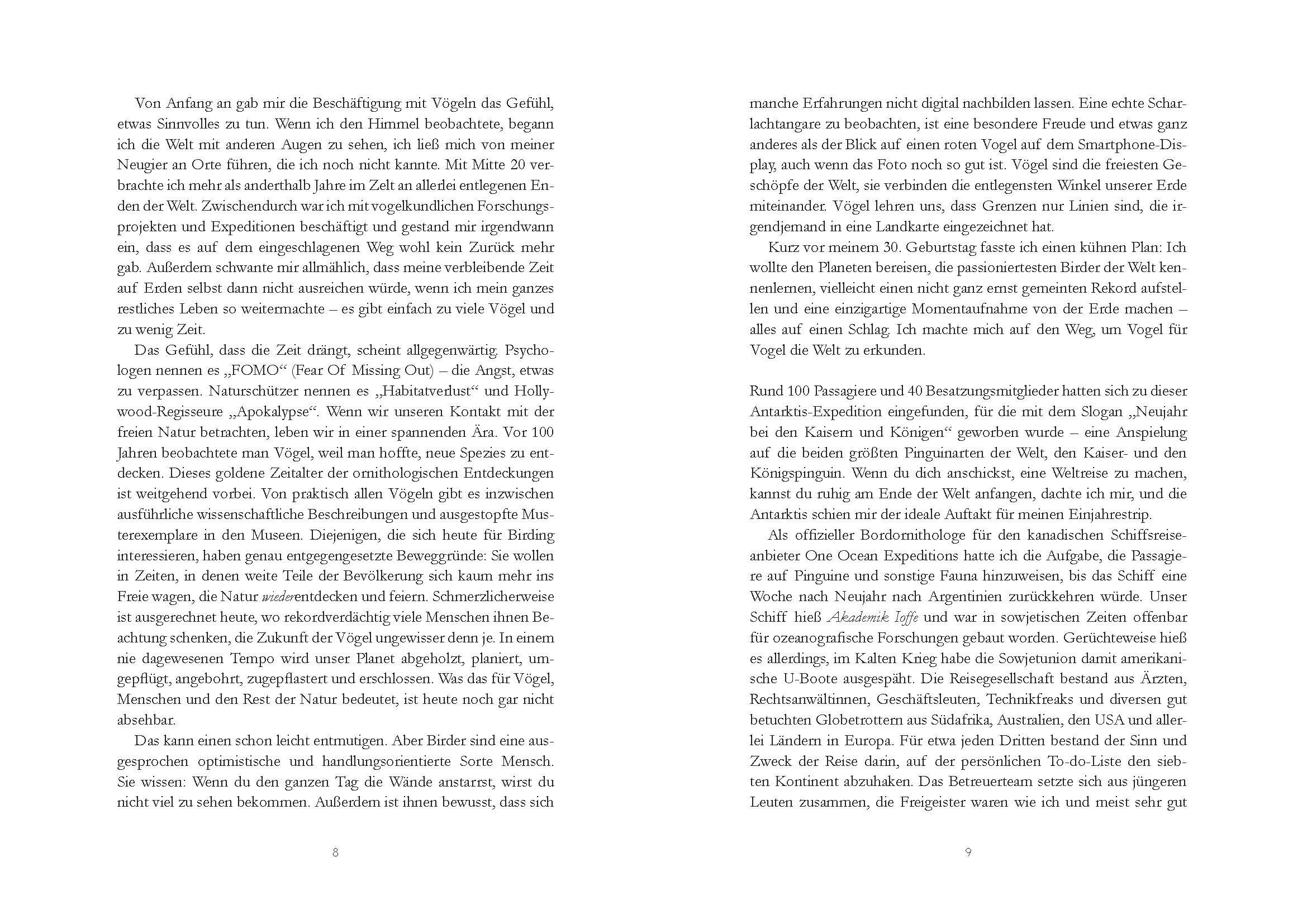 Noah Strycker geht mit einem Rucksack und einem Fernglas auf Weltreise, um innerhalb eines Jahres so viele Vogelarten wie möglich zu sichten. Dafür bereist er 41 Länder und fünf Kontinente und begegnet überall Menschen, die ihm bei seiner Mission helfen. Daru...