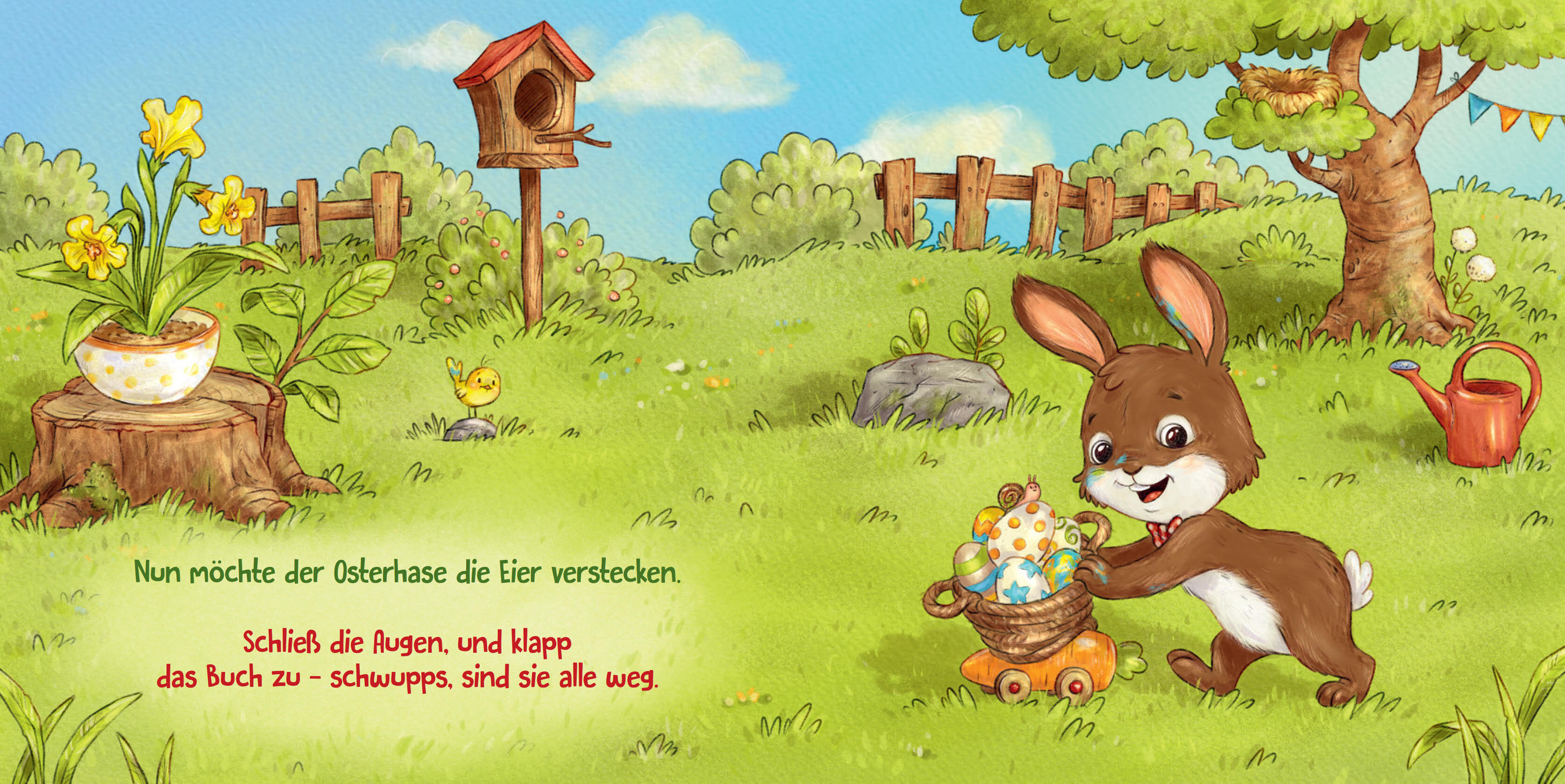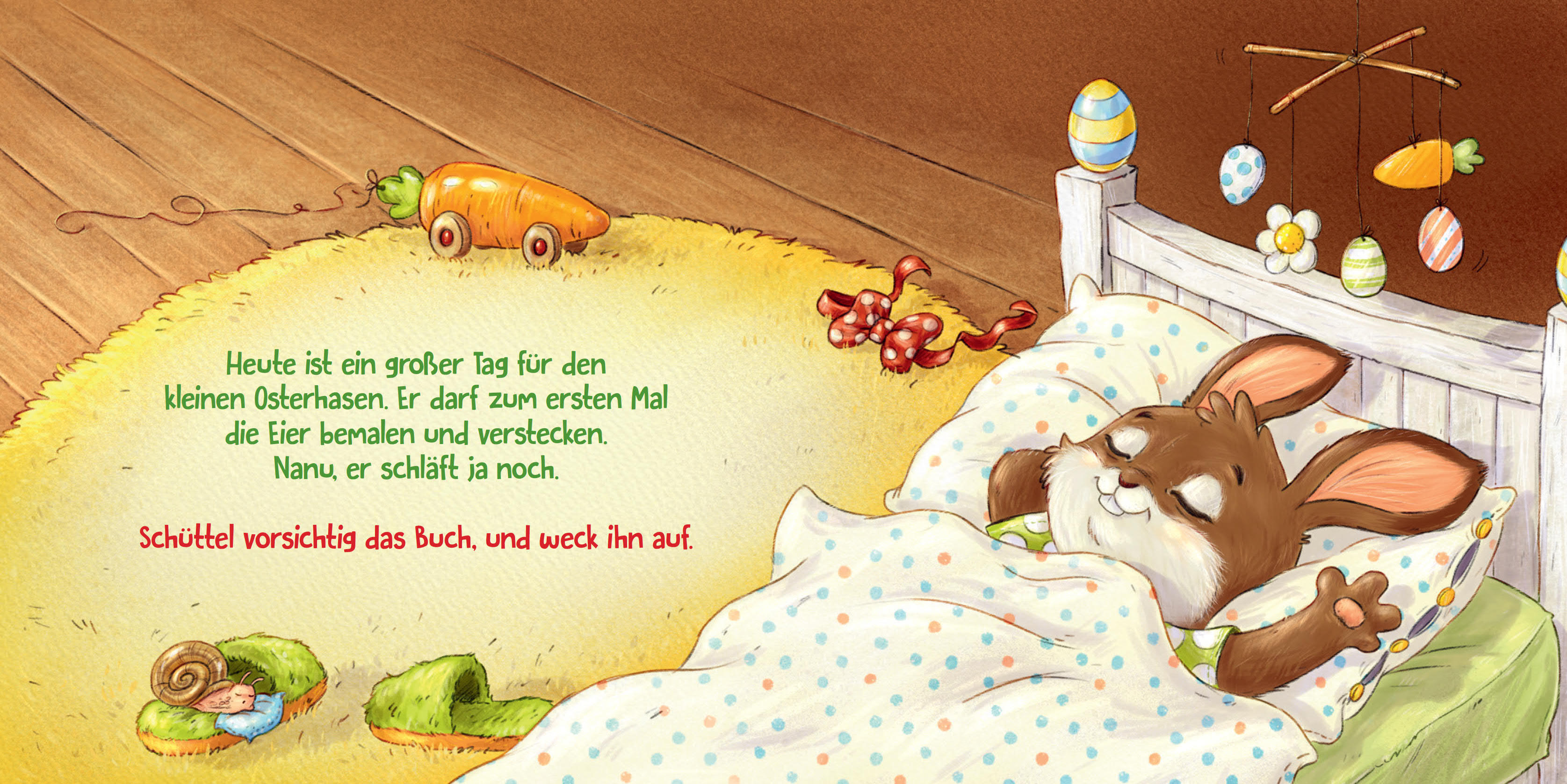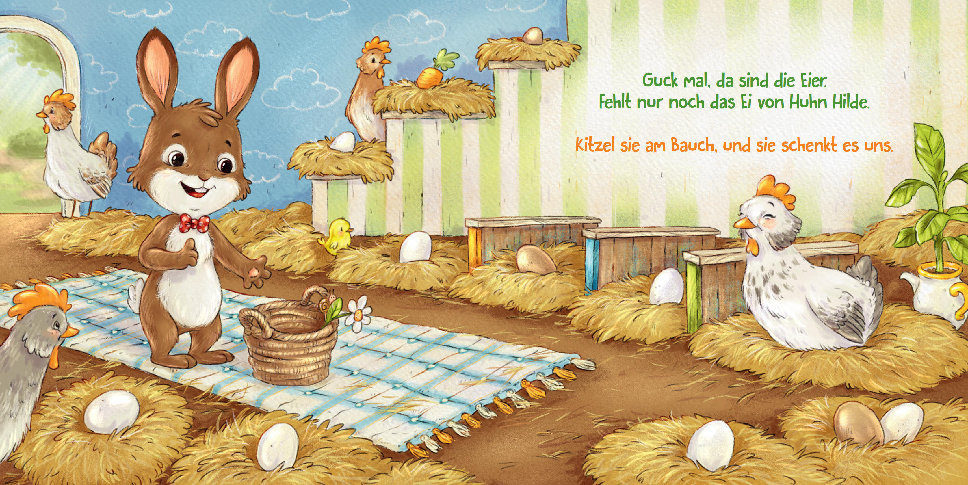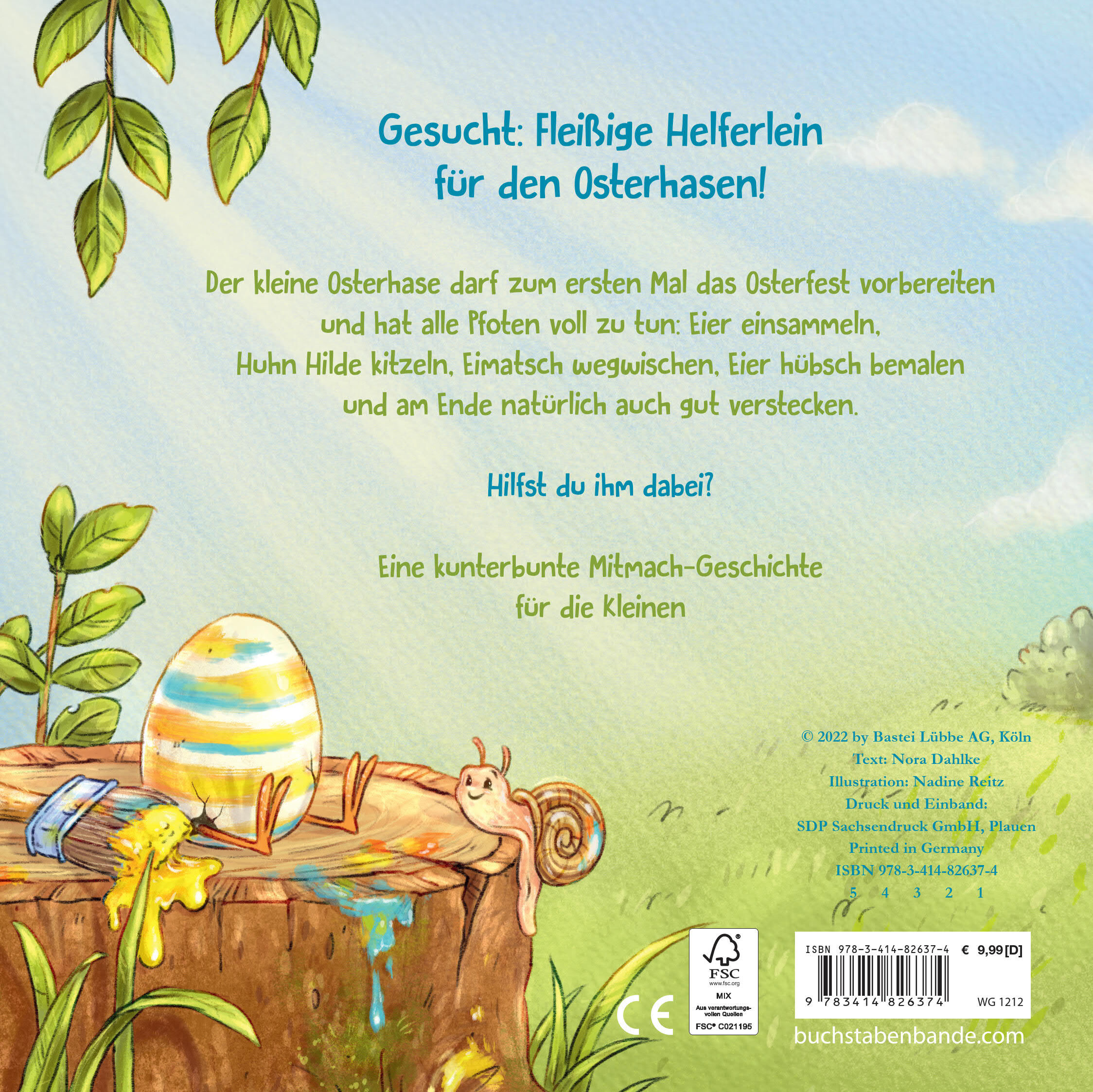 Der kleine Osterhase darf dieses Jahr zum allerersten Mal das Osterfest vorbereiten. Da kann er Hilfe gut gebrauchen! So muss Huhn Hilde im Hühnerstall erst einmal gekitzelt werden, bevor sie die Eier herausrückt. Es muss Eimatsch weggewischt und die übrigen ...