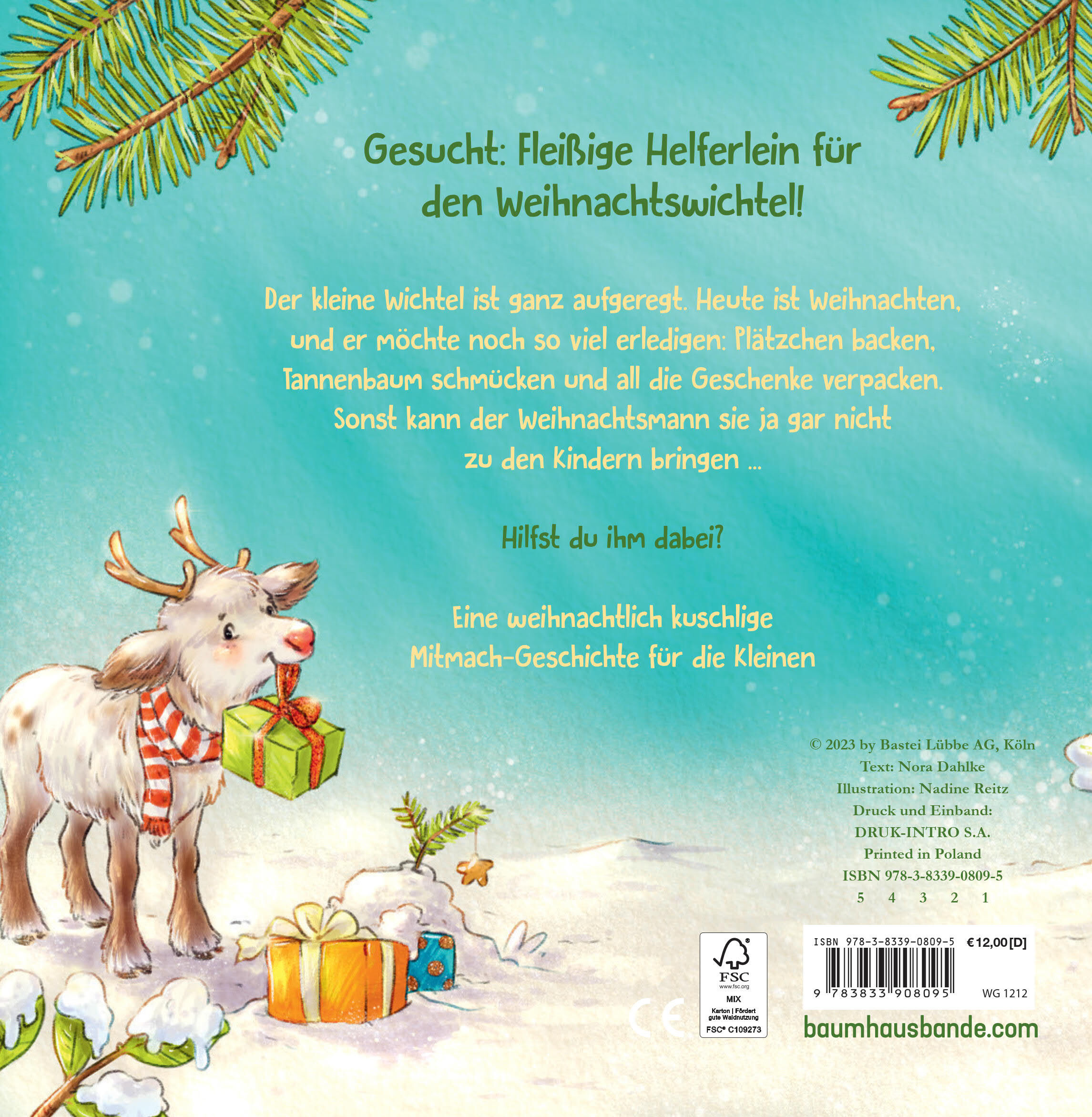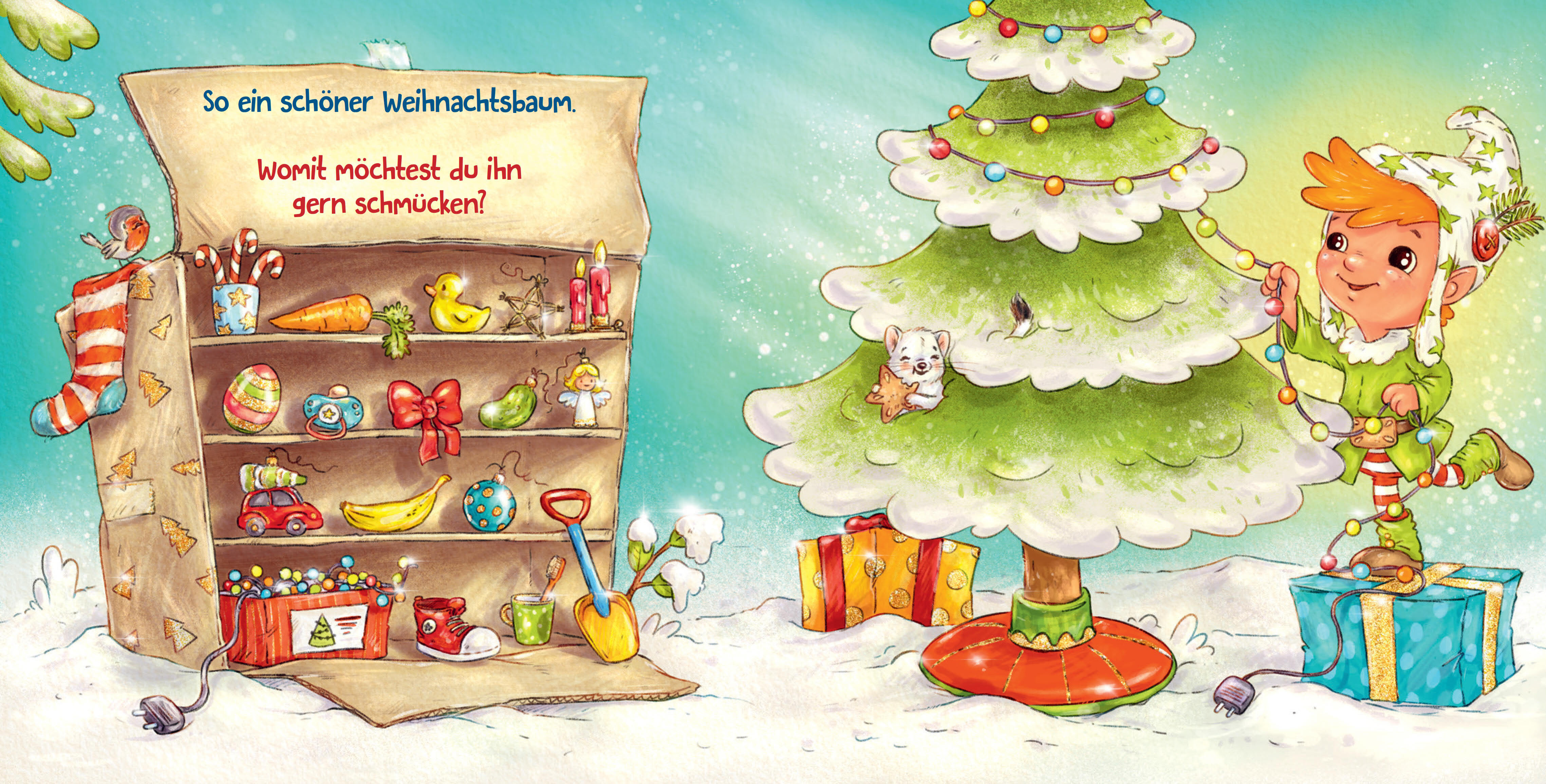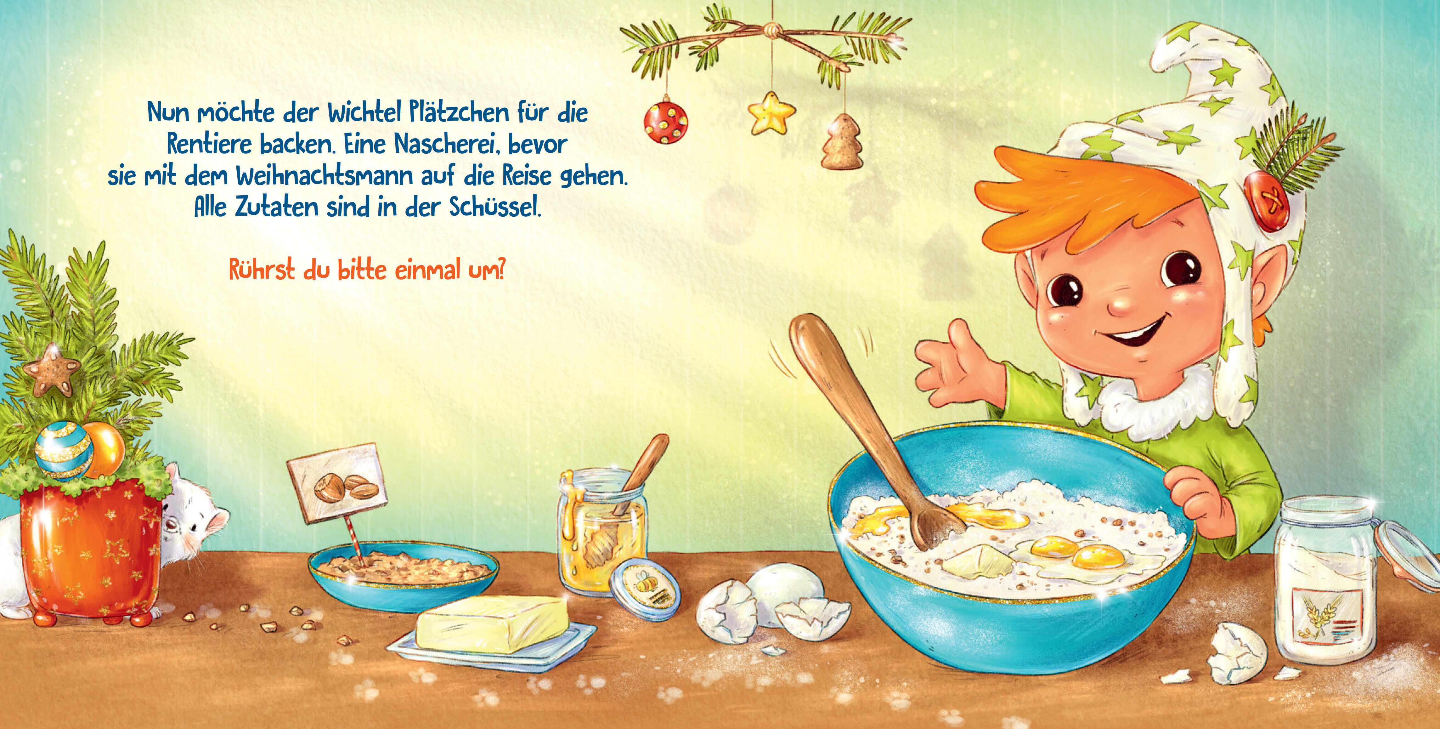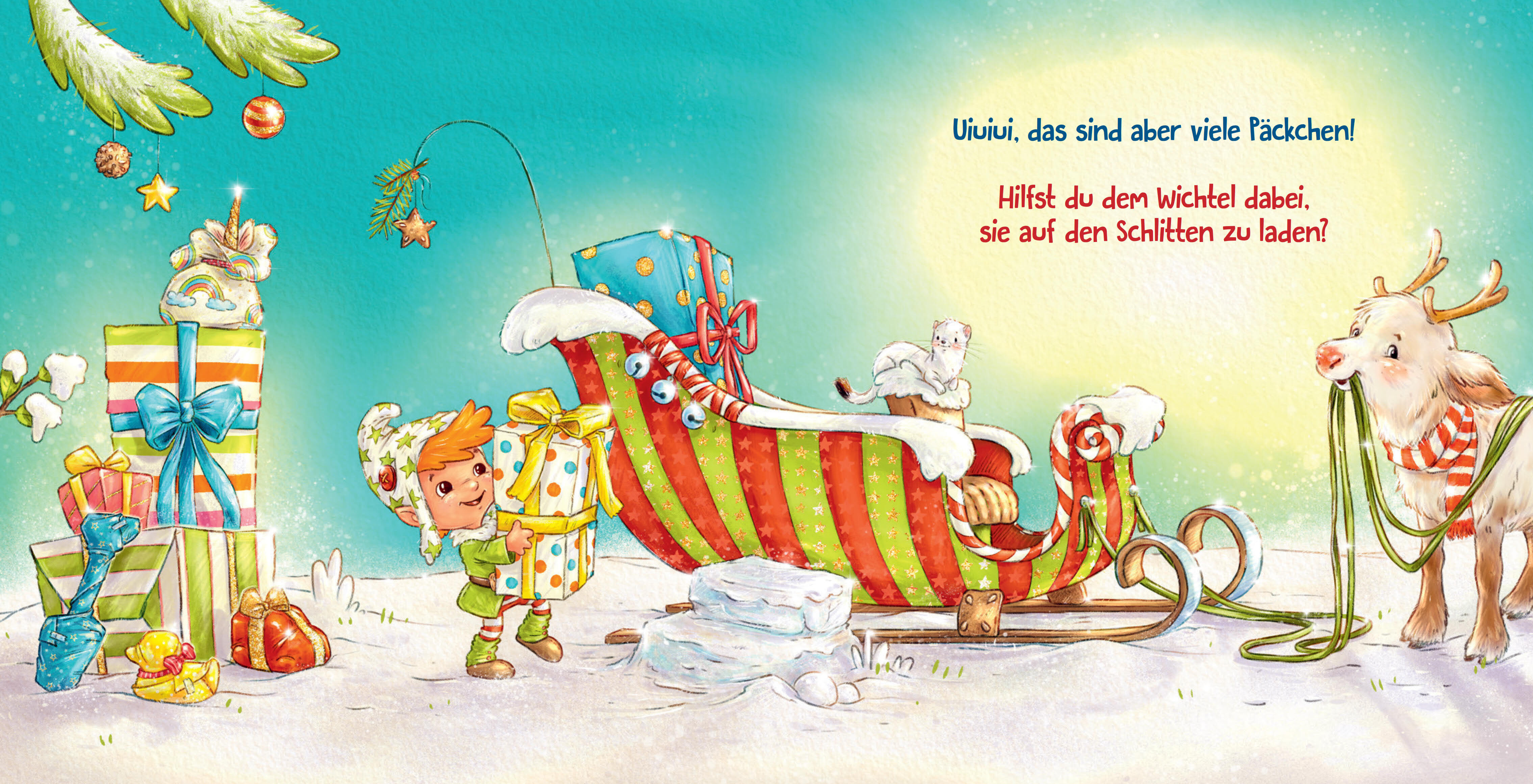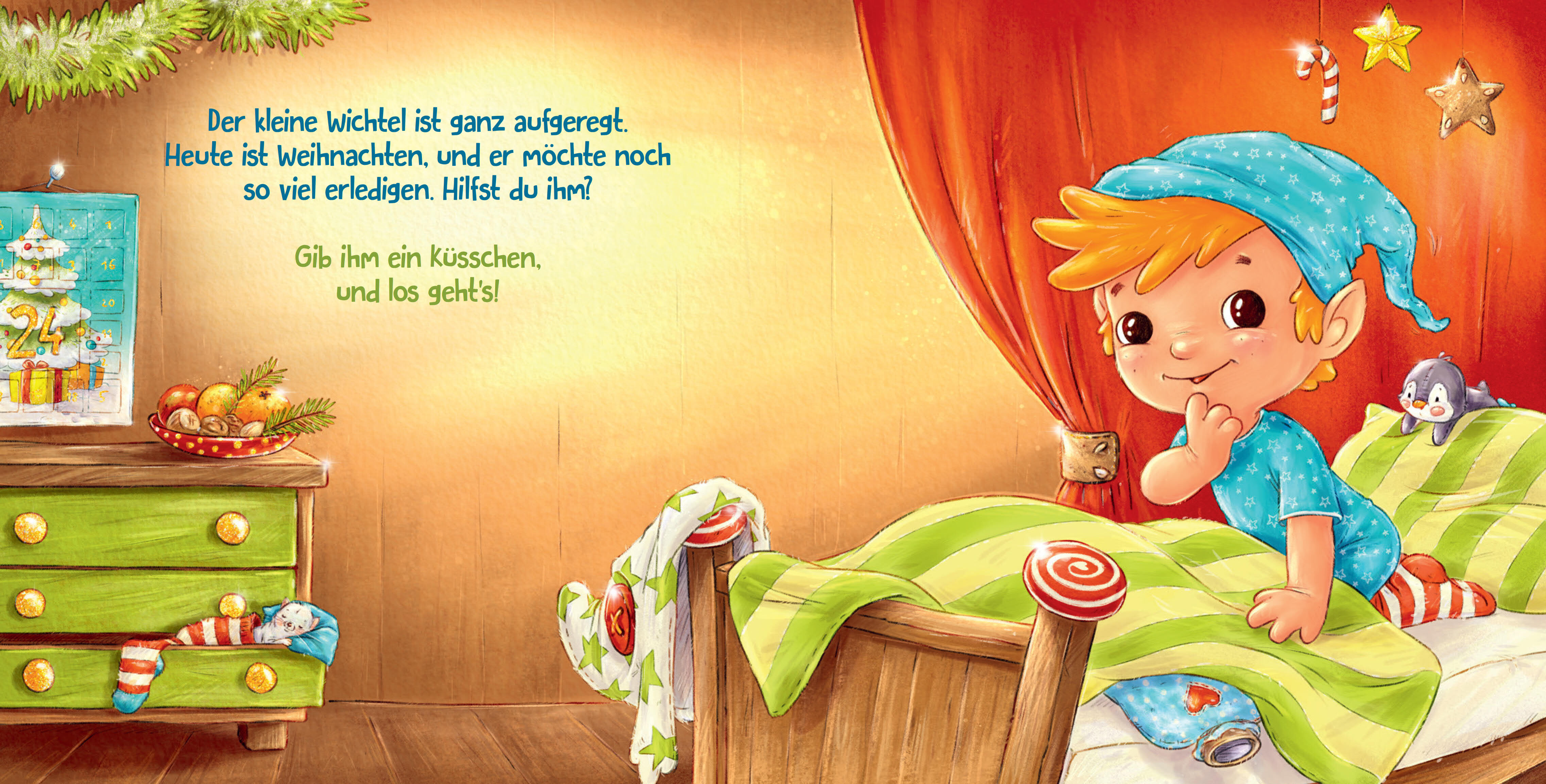 Der kleine Wichtel ist ganz aufgeregt. Heute ist Weihnachten, und es gibt noch so viel zu tun! Da kann er Hilfe gut gebrauchen. Den Plätzchenteig rühren und aufs Backbleck tupfen, Rudi Rentier streicheln und ein Tannenbäumchen besorgen. Womit könnte er es nur...