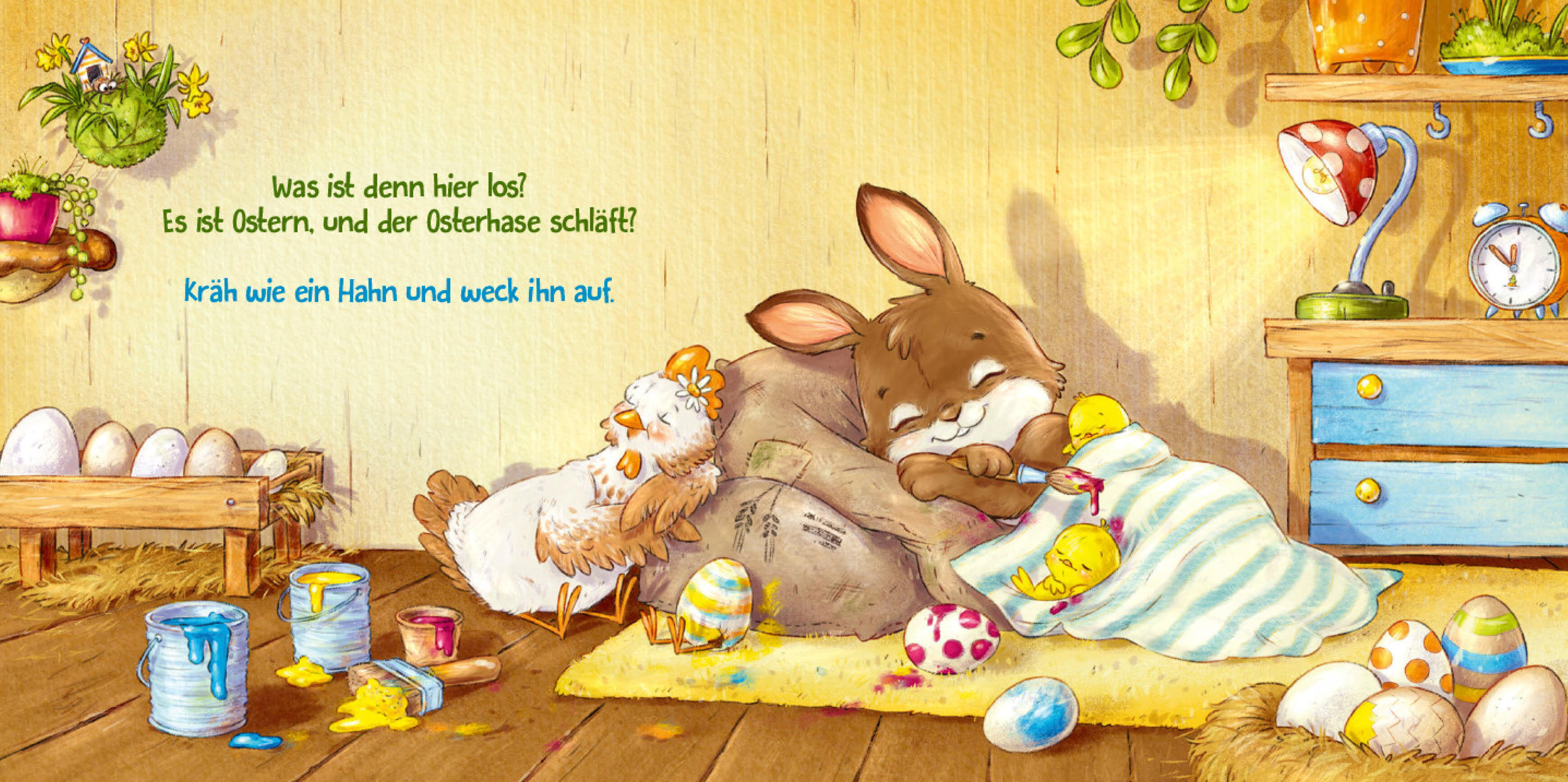 Was ist denn hier los? Es ist Ostern, und der Osterhase ist mitten in den Vorbereitungen eingeschlafen?! Selbst wenn man ihn kitzelt und so laut kräht wie ein Hahn, wird er nicht wach. Dafür aber Huhn Hilde. Kurzerhand schlüpft sie in die Rolle des Osterhasen...