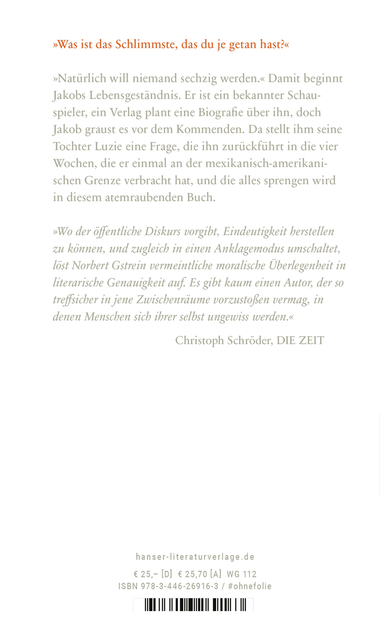 Nach seinem gefeierten Roman Als ich jung war Norbert Gstreins atemberaubendes Buch über die Abgründe der Menschheit. Auf der Shortlist des Deutschen Buchpreises 2021 Natürlich will niemand sechzig werden. Damit beginnt Jakobs Lebensgeständnis. Dem bekannten S...Nach seinem gefeierten Roman Als ich jung war Norbert Gstreins atemberaubendes Buch über die Abgründe der Menschheit. Auf der Shortlist des Deutschen Buchpreises 2021 Natürlich will niemand sechzig werden. Damit beginnt Jakobs Lebensgeständnis. Dem bekannten Schauspieler, über den ein Verlag eine Biografie plant, graust es vor dem Kommenden. Da stellt ihm seine Tochter die Frage, die alles sprengt: Was ist das Schlimmste, das du je getan hast? Jakob erinnert sich an einen Filmdreh an der mexikanisch-amerikanischen Grenze. Die Morde an Frauen und das Elend dort bekam er bloß distanziert mit aber zwei Mal war er plötzlich mittendrin. Er schämt sich, ringt mit den simplen Urteilen der Welt und sehnt sich in gleißenden Erinnerungen nach dem Glück. Warum ist er kein Original, sondern stets nur der zweite Jakob? Norbert Gstrein schreibt einen Roman, der mitreißende, große Kunst ist.