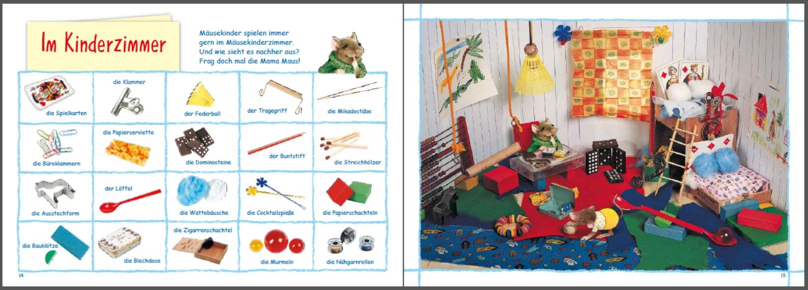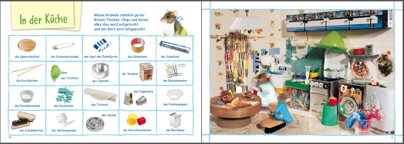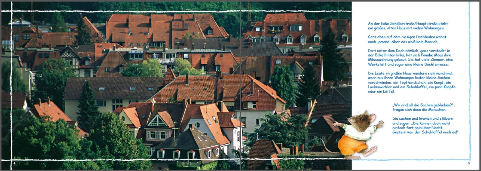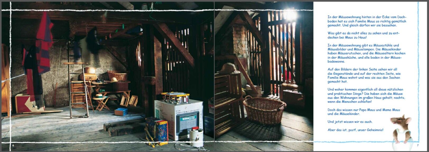 Oben im Dachboden des alten Hauses wohnt still und heimlich Familie Maus. Ihre Mäusewohnung hat viele Zimmer, eine Werkstatt und sogar eine Terrasse. Und wie schön sich Familie Maus eingerichtet hat! Woher Familie Maus ihre Möbel, Lampen Bilder oder Spielsache...