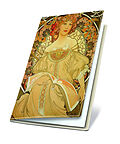 Broschur mit runden Ecken und goldener Klammer, Papier chamois, dekorativ liniert. Dessin: Alphonse MuchaMotiv: Reverie