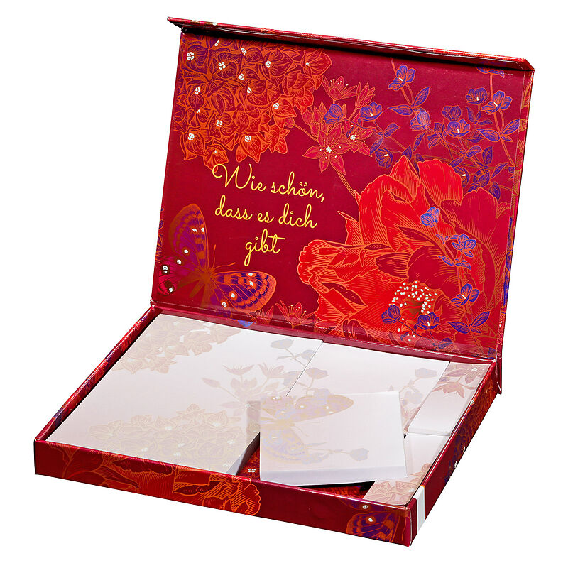 Die Notizzettelbox »Wie schön, dass es dich gibt« enthält fünf Blöcke in drei verschiedenen Größen. Sowohl die Blöcke als auch die praktische Magnetbox sind in einem herrlich weinroten Design gestaltet, das vor allem Hortensien-Illustrationen zeigt und ein wen...