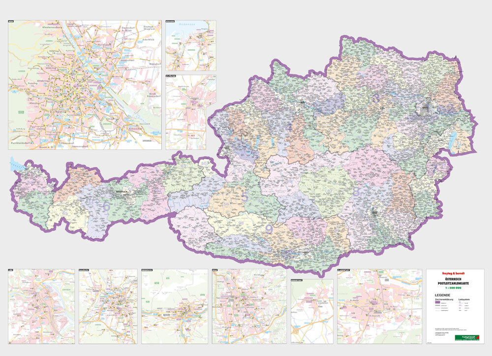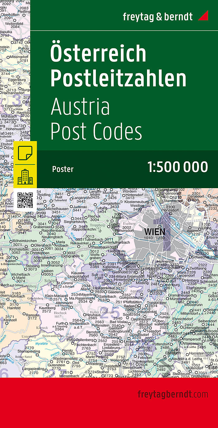 Die freytag & berndt "Österreich Postleitzahlenkarte 1:500.000" ist gefaltet und mit einem Weichkartonumschlag geschützt. Format ca. 121,5 x 84 cm, gefaltet, 9 Landeshauptstädte und Leitsystem; freytag & berndt Postleitzahlenkarten sind außerdem in fol...