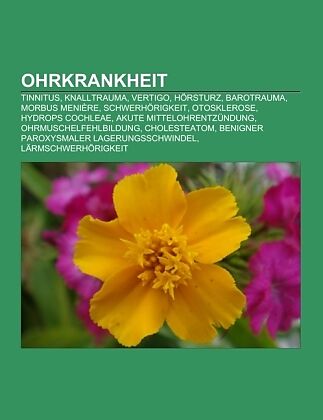 Quelle: Wikipedia. Seiten: 53. Kapitel: Tinnitus, Knalltrauma, Vertigo, Hörsturz, Barotrauma, Morbus Menière, Schwerhörigkeit, Otosklerose, Hydrops cochleae, Akute Mittelohrentzündung, Ohrmuschelfehlbildung, Cholesteatom, Benigner paroxysmaler Lagerungsschwind...