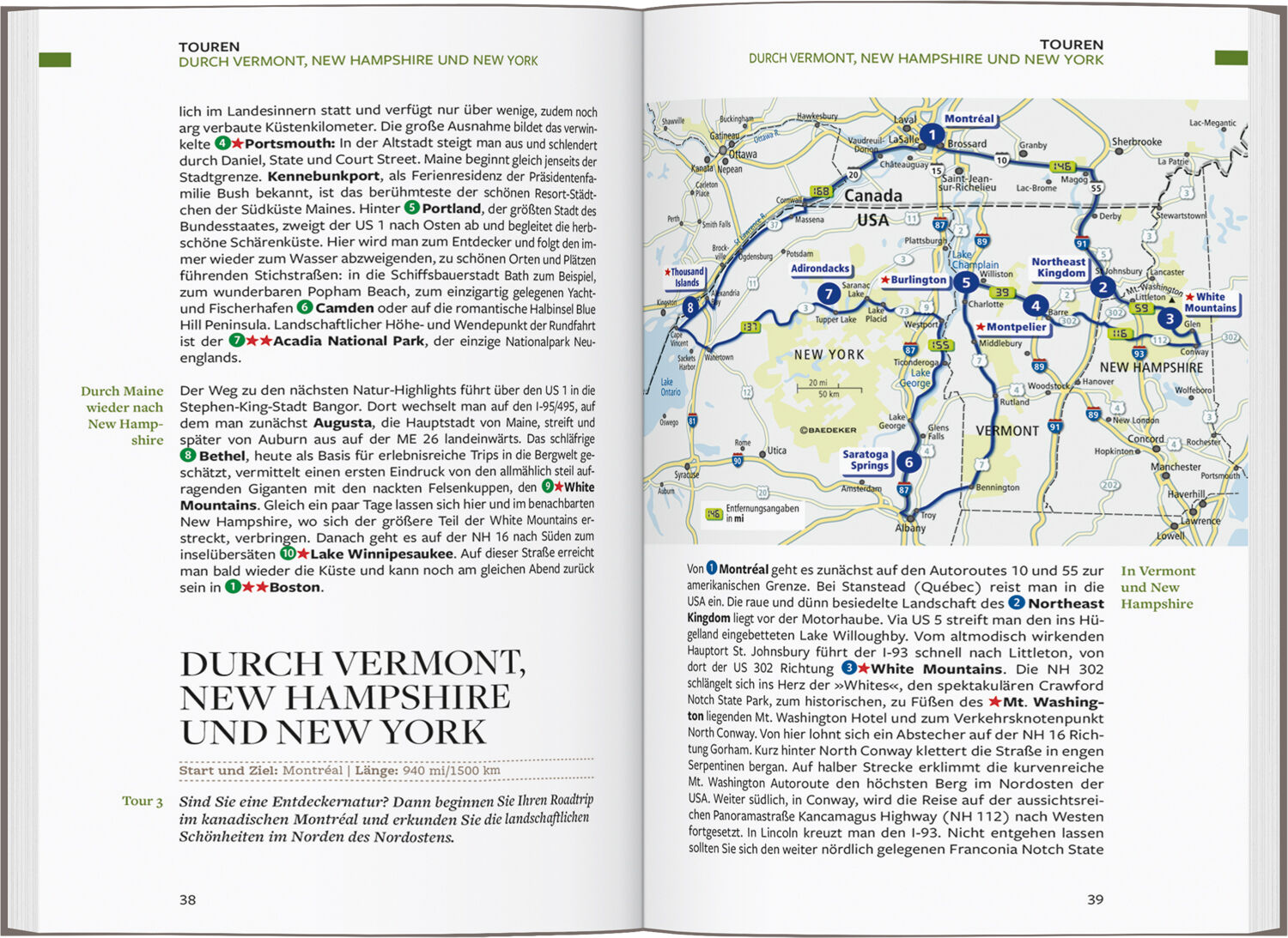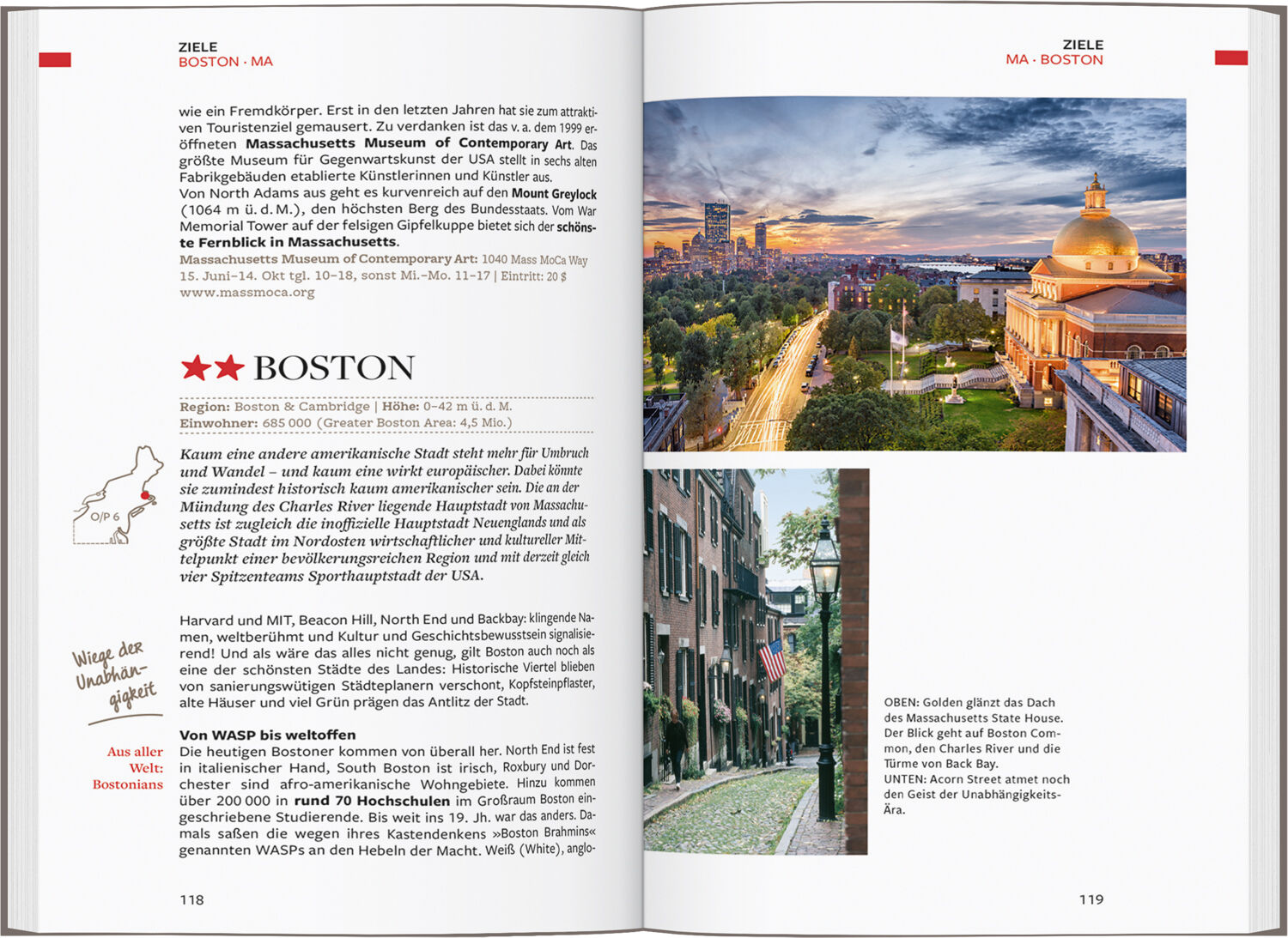 Es sind die stillen Stars Amerikas unser Reiseführer USA Nordosten begleitet Sie durch acht Bundesstaaten der USA: von New York mit der Metropole New York City ins Idyll nach Pennsylvania, Vermont und Connecticut zu unberührter Natur in New Hampshire und zur ...Es sind die stillen Stars Amerikas unser Reiseführer USA Nordosten begleitet Sie durch acht Bundesstaaten der USA: von New York mit der Metropole New York City ins Idyll nach Pennsylvania, Vermont und Connecticut zu unberührter Natur in New Hampshire und zur rauen Küste von Maine bis in den kleinsten Bundesstaat Rhode Island *und nach Massachusetts, wo damals der Unabhängigkeitskrieg begann. Spannende Touren verbinden Weltstädte wie Boston, Portland und Pittsburgh mit der wilden Natur der Niagara Falls und den grünen Landschaften des Hudson Valley. Orte, an denen Sie auf Ihrer USA-Rundreise durch den Nordosten ebenfalls vorbeischauen sollten, sind im Kapitel Sehenswürdigkeiten von A - Z beschrieben: vom geschichtsträchtigen Gettysburg über die Atlantikinsel Nantucket bis nach Hartford. Unsere Reisetipps verraten, warum es sich lohnt, für die New YorkerSehenswürdigkeiten Tickets online zu bestellen, wo Sie das beste Café mit Aussicht in den White Mountains von New Hampshire finden und wie Sie den Nordosten der USA entspannt erleben damit Ihre USA-Reise* einfach einmalig wird.