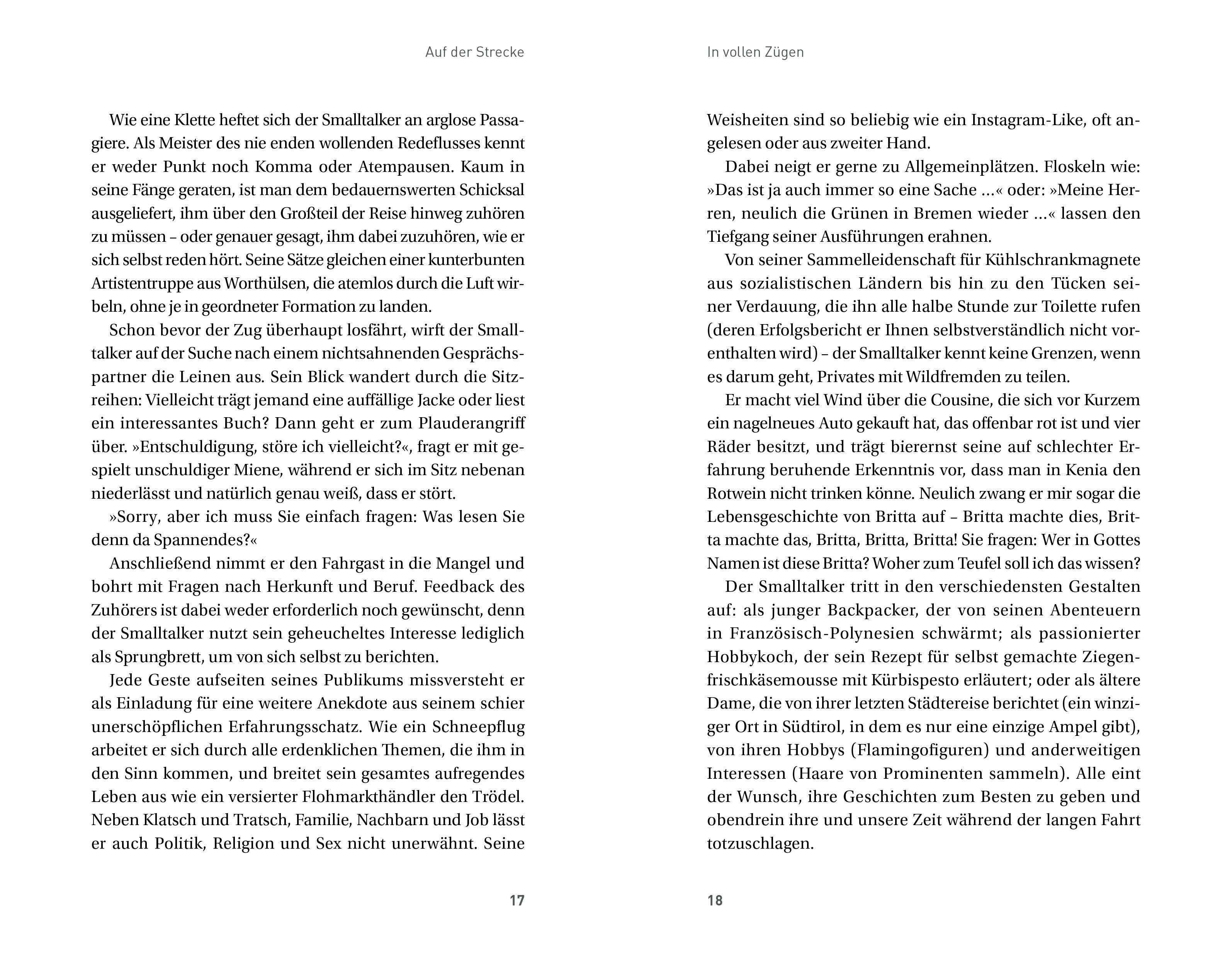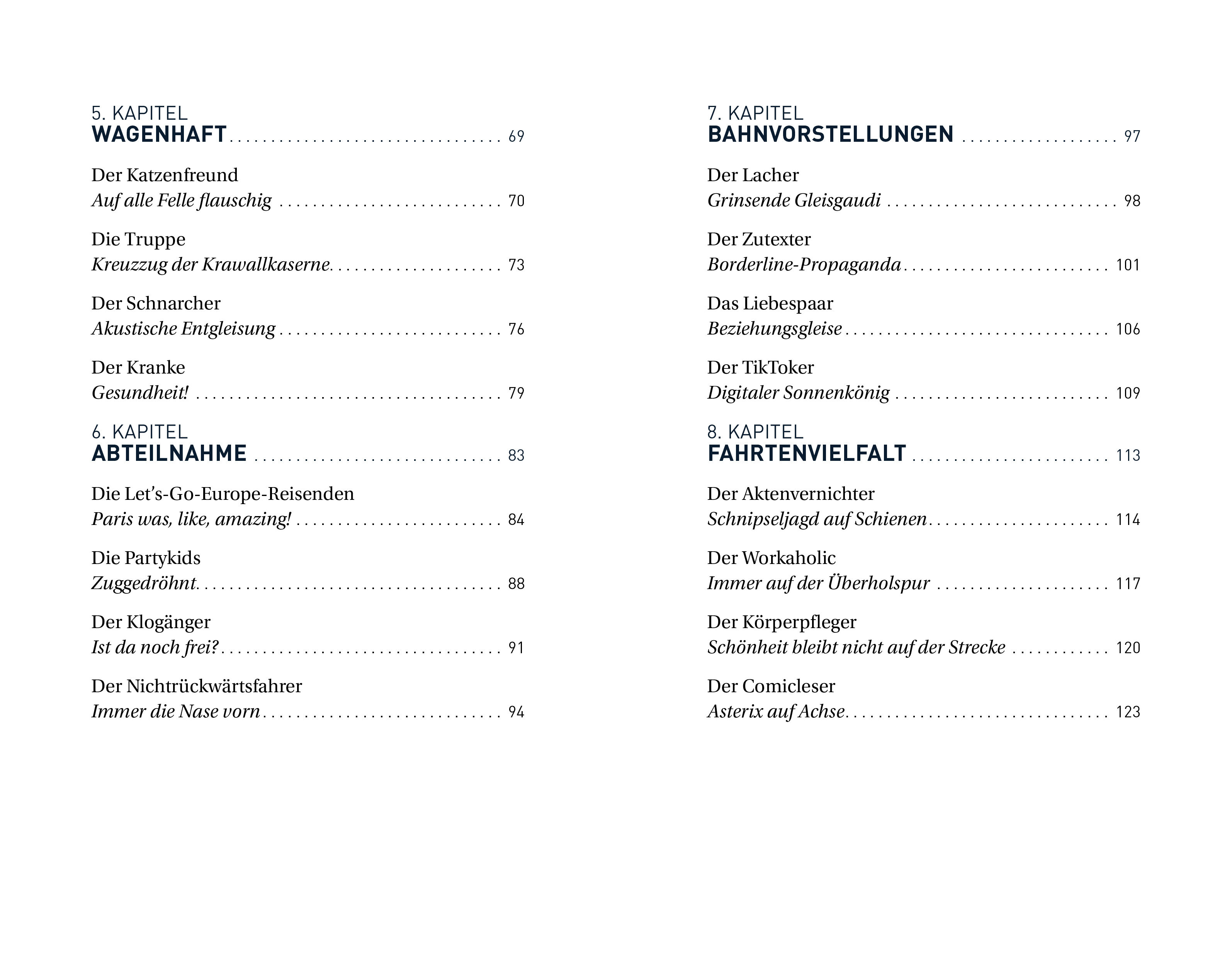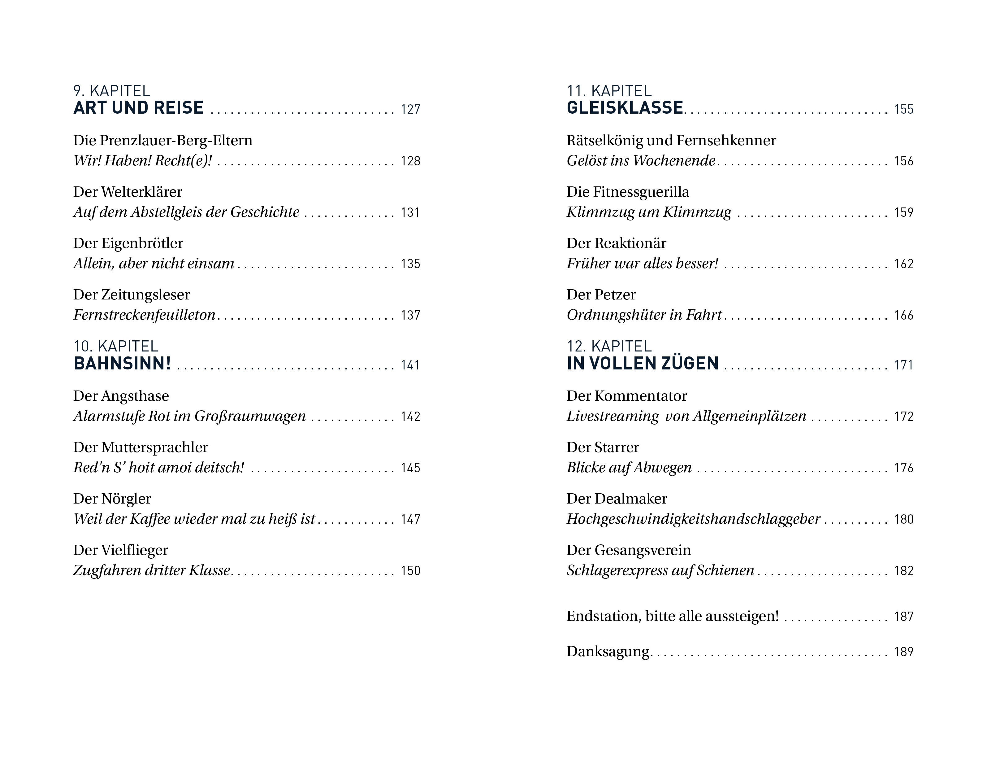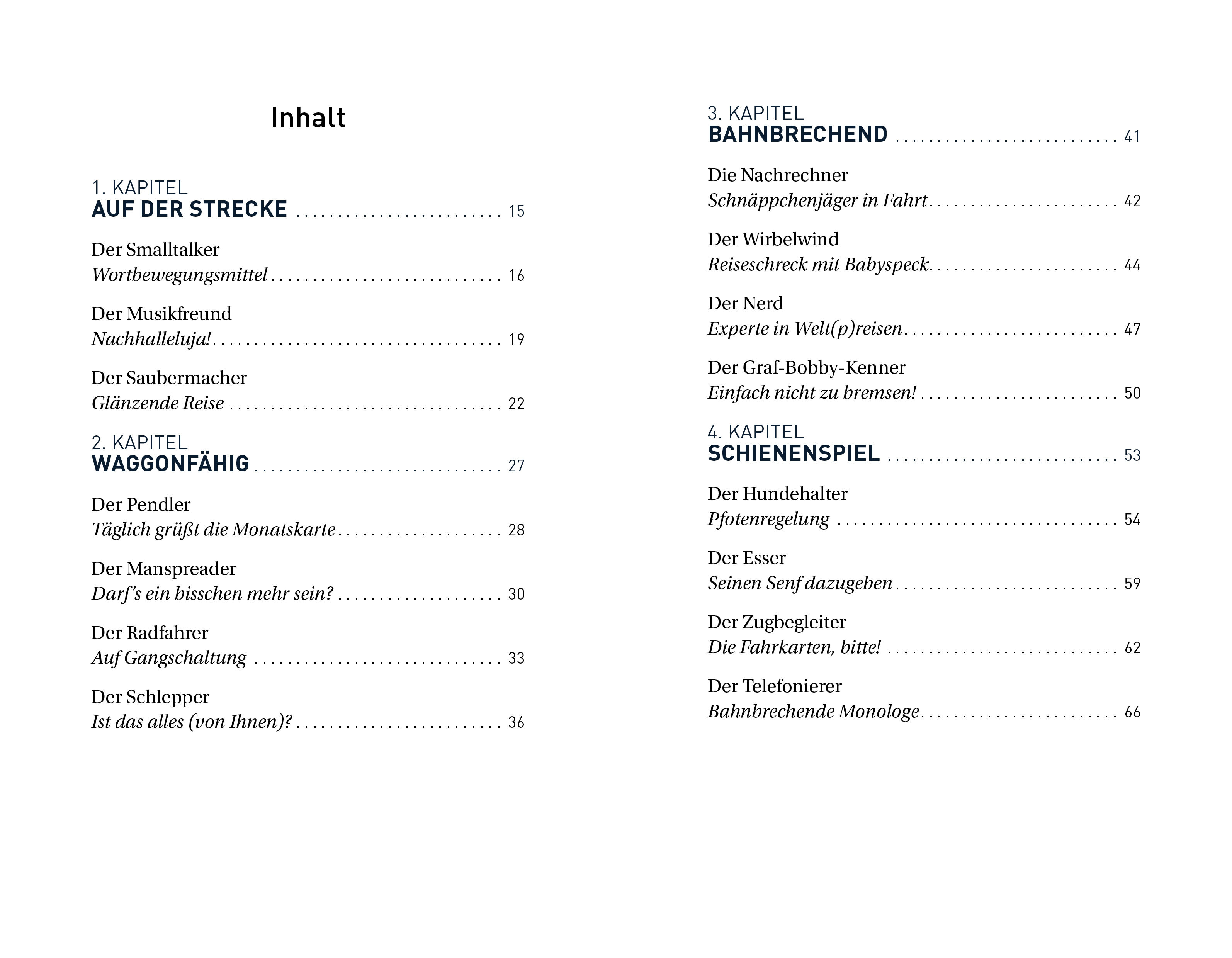 Wer öfter mit der Bahn unterwegs ist, kennt sie alle: die Smalltalker, die sich nie um ein Gespräch verlegen fühlen; die Pendler, die täglich mit grimmiger Routine ihren Platz verteidigen; die Esser, die genüsslich ihre Proviantboxen plündern In dieser vergnüg...