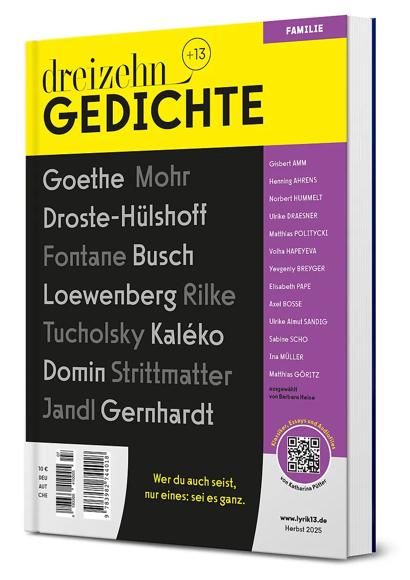 Das Magazin dreizehn +13 Gedichte hat sich in kurzer Zeit eine hochwertige und begeisterte Leserschaft erarbeitet. Die sechste Ausgabe versammelt Klassiker und zeitgenössische Texte zum Thema "Familie". Im vorderen Teil der siebten Ausgabe der Lyrik-Reihe präs...