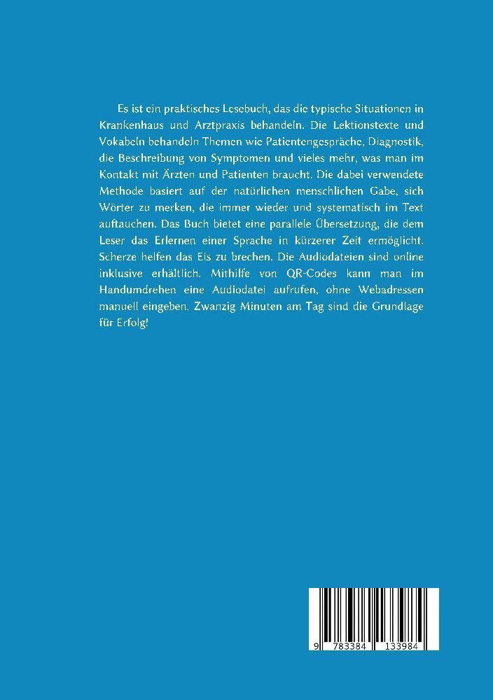 Es ist ein praktisches Lesebuch, das die typische Situationen in Krankenhaus und Arztpraxis behandeln. Die Lektionstexte und Vokabeln behandeln Themen wie Patientengespräche, Diagnostik, die Beschreibung von Symptomen und vieles mehr, was man im Kontakt mit Är...