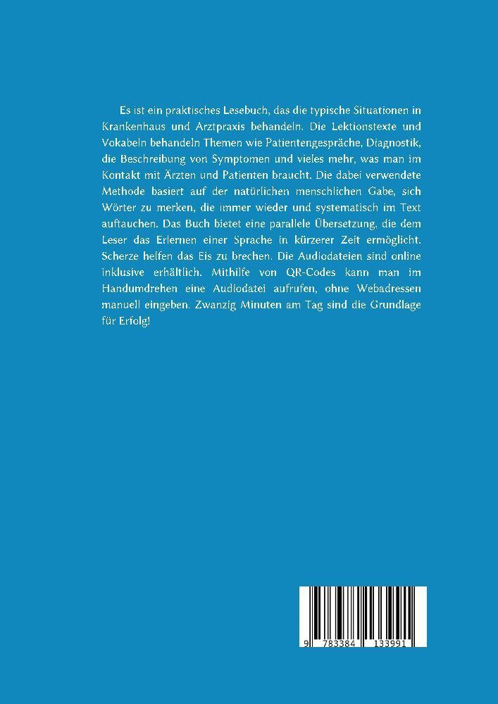Es ist ein praktisches Lesebuch, das die typische Situationen in Krankenhaus und Arztpraxis behandeln. Die Lektionstexte und Vokabeln behandeln Themen wie Patientengespräche, Diagnostik, die Beschreibung von Symptomen und vieles mehr, was man im Kontakt mit Är...