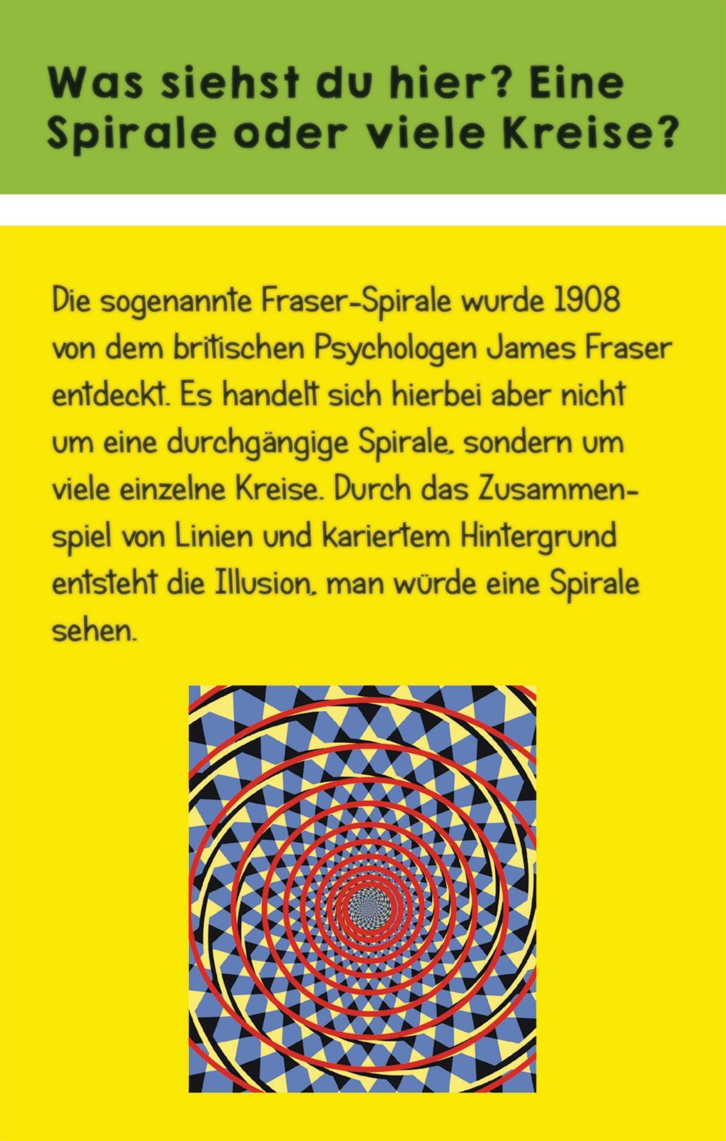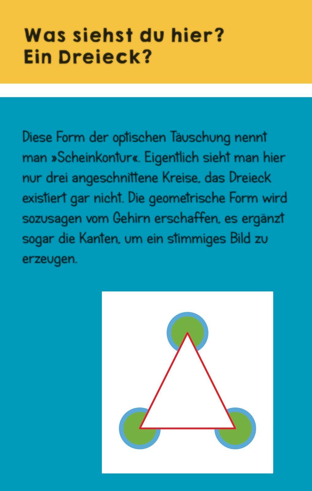 Ausprobieren und staunen 50 verblüffende optische Täuschungen sind in dieser Kartenbox zu finden. Überraschende visuelle Illusionen, unmögliche Objekte, tanzende Punkte, ungewöhnliche Linien oder 3D-Effekte verwirren unsere Sinne. Auf jeder Karte findet sich ...