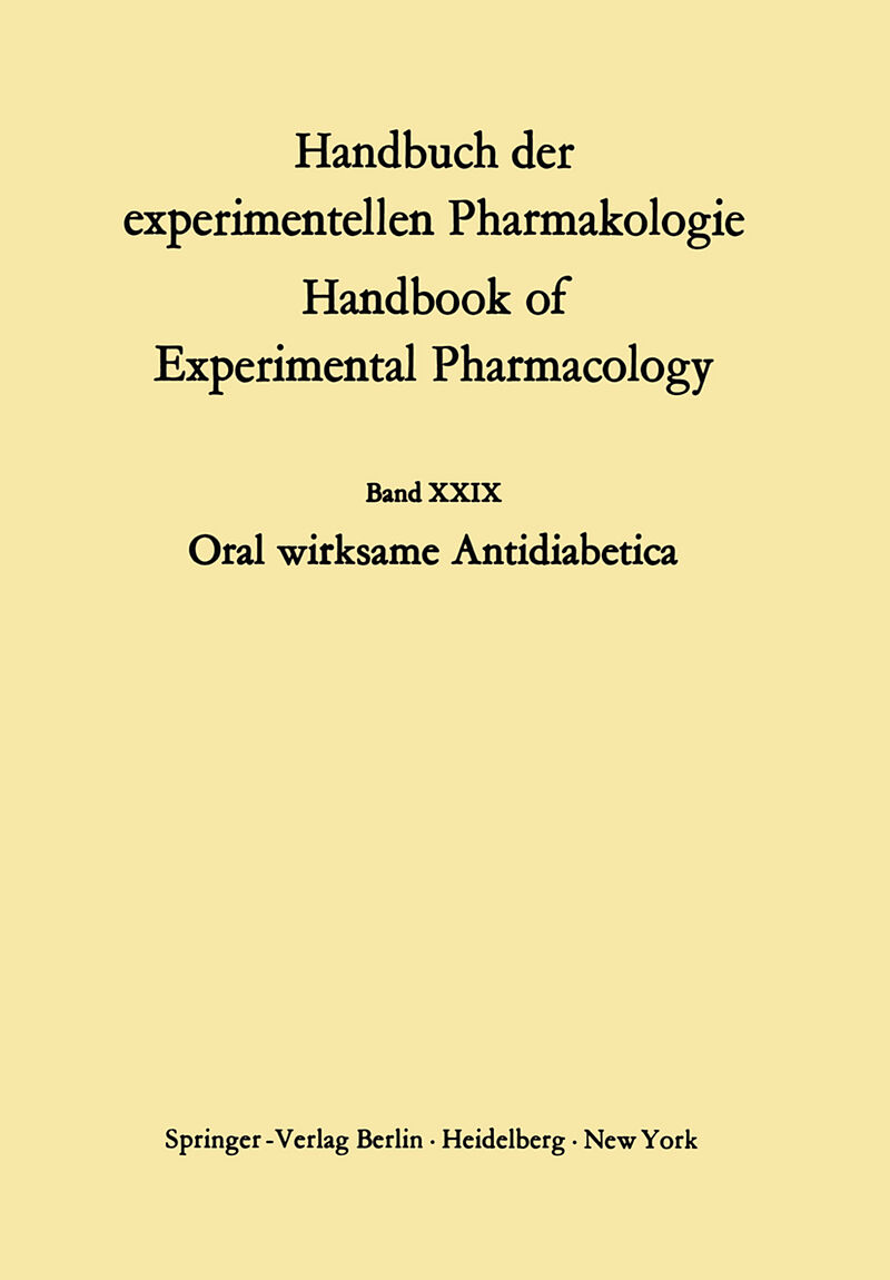 Sulfonylharnstoffderivate und verwandte Verbindungen als blutzuckersenkende Substanzen. Beziehungen zwischen Konstitution und Wirksamkeit.- Stoffgliederung.- Addendum.- Die Analytik der Sulfonylharnstoffe.- A. Physikalische Eigenschaften.- B. Nachweismethoden.- C. Quantitative Bestimmungsmethoden.- D. Übersicht über die wichtigsten Arzneibücher.- Literatur.- Zum Stoffwechsel der Sulfonylharnstoffe.- A. Einleitung.- B. Tolbutamid.- C. Carbutamid.- D. Chlorpropamid.- E. Glykodiazin.- F. Glibenclamid (HB 419).- Literatur.- Zur Pharmakologie und Toxikologie der blutzuckersenkenden Sulfonamide.- Literatur.- Addendum Weitere orale Antidiabetica verschiedener chemischer Stoffklassen.- I. Salicylsäure und ihre Derivate.- II. Para-aminosalicylsäure (PAS).- III. 2,4-Dinitrophenol (DNP).- IV. Mesoxalsäure.- V. Seeale-Alkaloide.- VI. Sympatholytische Imidazolderivate.- VII. Antihistaminica.- VII. Hypoglycin A und B.- IX. Monojodessigsäure und Jodacetamid.- X. Tris-Puffer.- XI. 5-Methylpyrazol-3-carbonsäure (MPC).- XII. 3-5-Dimethylisoxazol (DMIO).- XIII. 3-Methyl-5-isoxazolcarbonsäure.- XIV. Valeramid.- XV. 2-Piperazino-3H,4-quinazolon-monoacetat.- XVI. Tranylcypromin.- XVII. Chemotherapeutische Sulfonamide.- XVIII. 1 -Methyl-4- (3 -methyl-5-isoxazolyl) -pyridinium.- XIX. 4-[3(5)-Pyrazolyl]-pyridin-Verbindungen.- XX. Indol-2-carbonsäuren.- Literatur.- Enzyme, Proteinbiosynthese und oral wirksame Antidiabetika.- A. Einleitung.- B. Proteinbiosynthese.- C. Enzymreaktionen.- Literatur.- Light Microscopic and Electron Microscopic Changes and in Vitro Effects of Sulfonylureas.- 1. Morphologic Events in Beta Cell Secretion.- 2. Biochemical Events in Beta Cell Secretion.- 3. Chronic Effects of Sulfonylureas on the Islets of Langerhans.- Summary.- References.- Biguanide(Experimenteller Teil).- Einführung.- Literatur.- Biguanide (Klinischer Teil).- Literatur.- Namenverzeichnis.