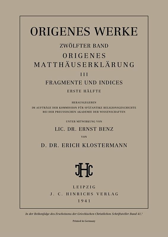 Origenes: Origenes Werke / Origenes Matthäuserklärung III: Fragmente und Indices, Erste Hälfte