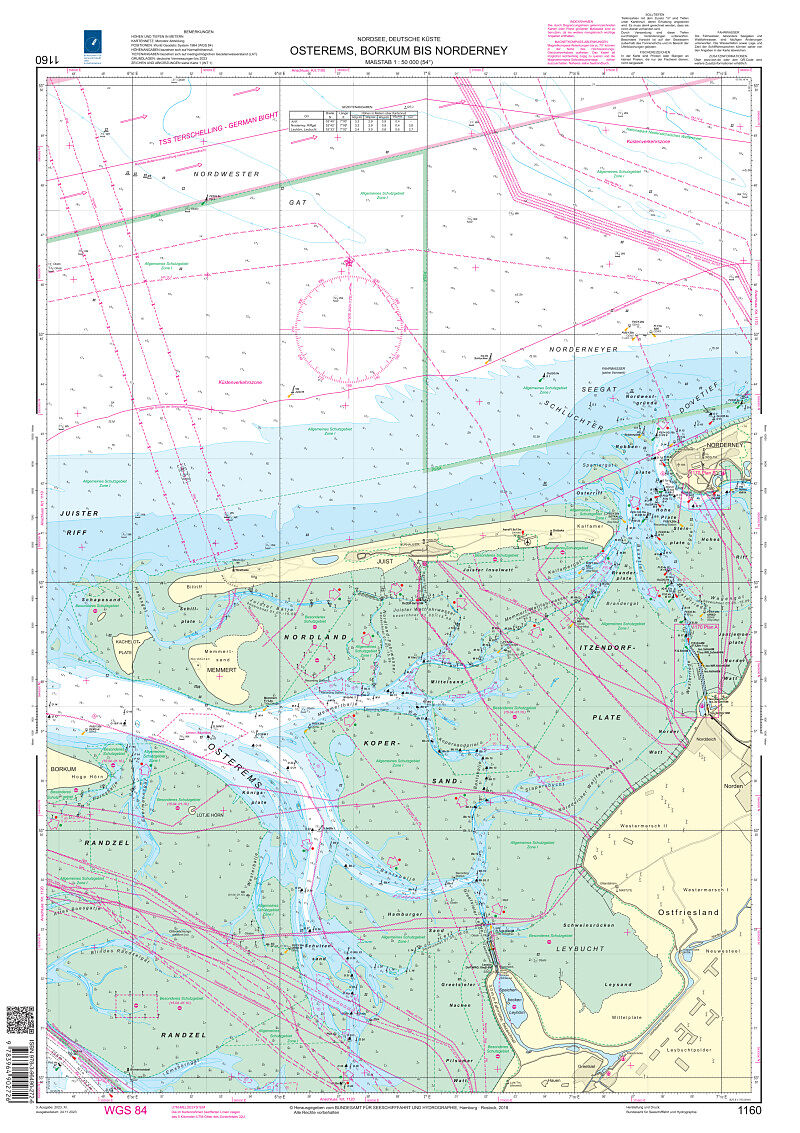 Amtliche deutsche Seekarte des Bundesamtes für Seeschifffahrt und Hydrographie für den Bereich der Emsmündung (Nordsee), Borkum und Norderney.