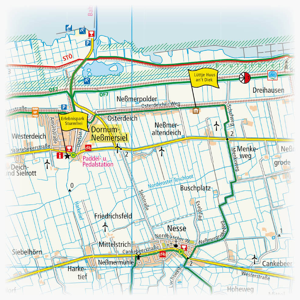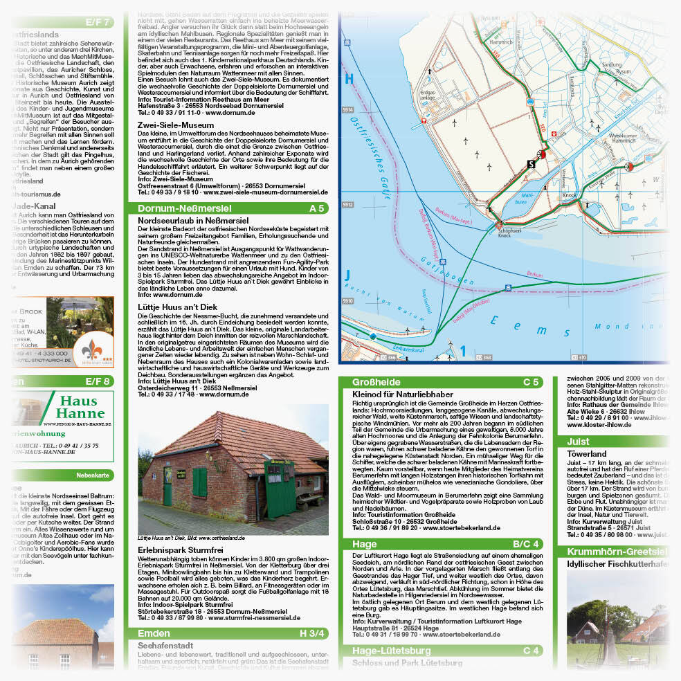 Die Rad- und Wanderkarte umfasst das Gebiet nordwestlich von Aurich. Fünf Nebenkarten gestatten einen hilfreichen Überblick über die vorgelagerten Inseln Borkum, Langeoog, Norderney, Juist und Baltrum, die mit Fähren von den Küstenorten erreichbar sind. Reizvo...