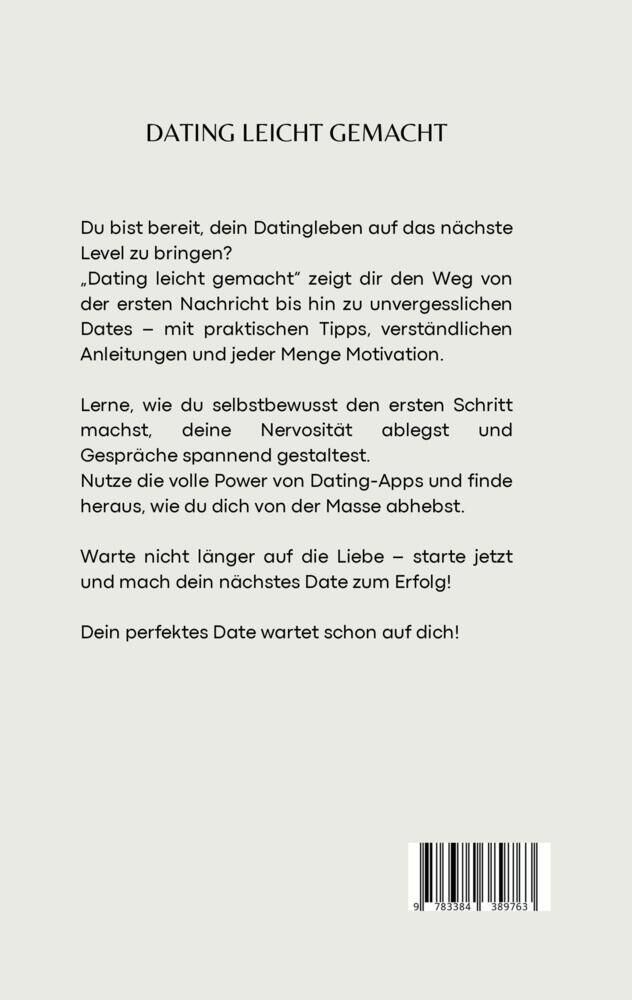 "Dating leicht gemacht: Von der ersten Nachricht bis zum perfekten Date" Du bist es leid, dich durch unzählige schlechte Dates zu kämpfen und dich dabei ständig unsicher zu fühlen? Du wünschst dir, mit Selbstbewusstsein und einem klaren Plan ins Datingleben zu...