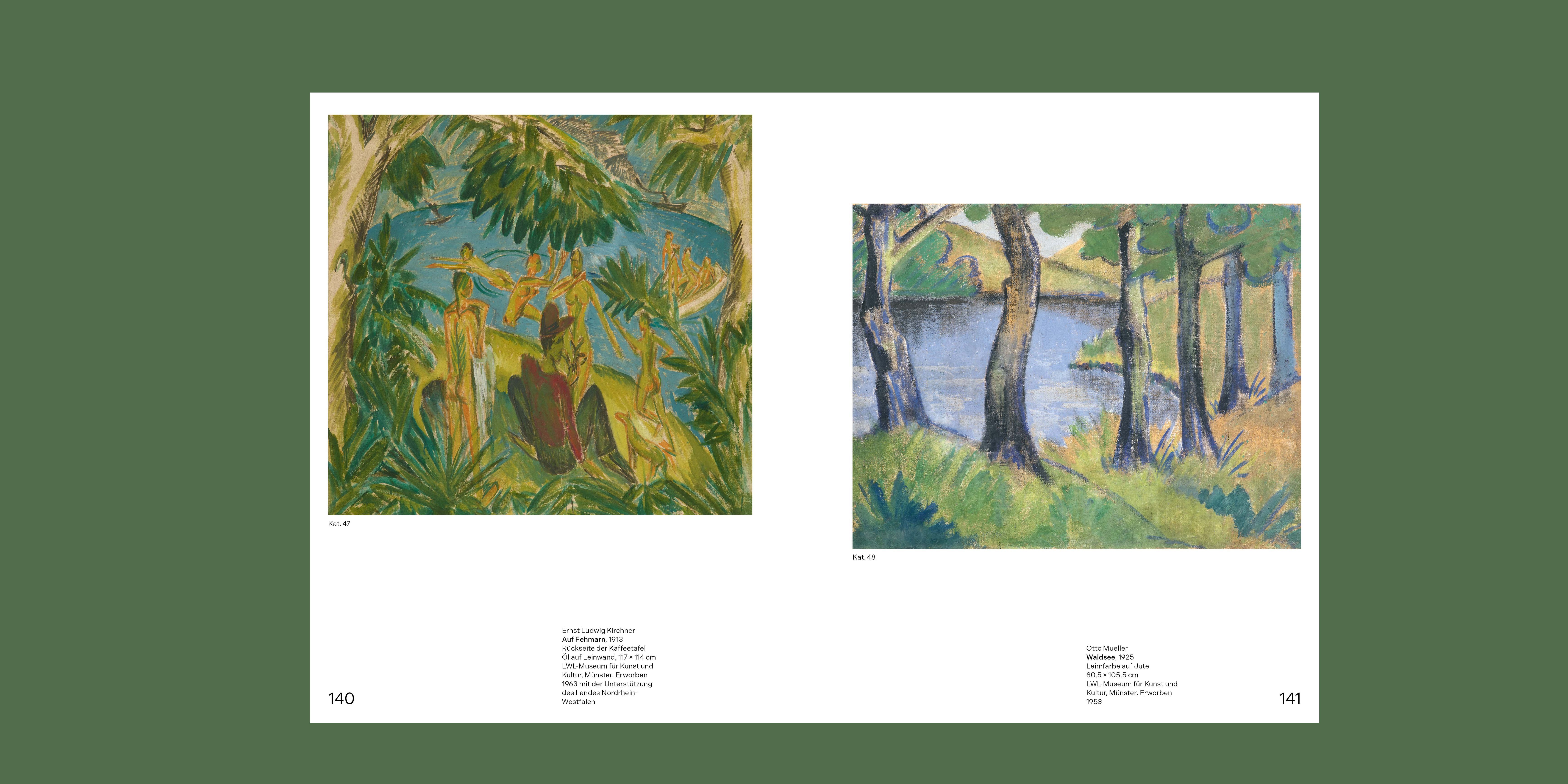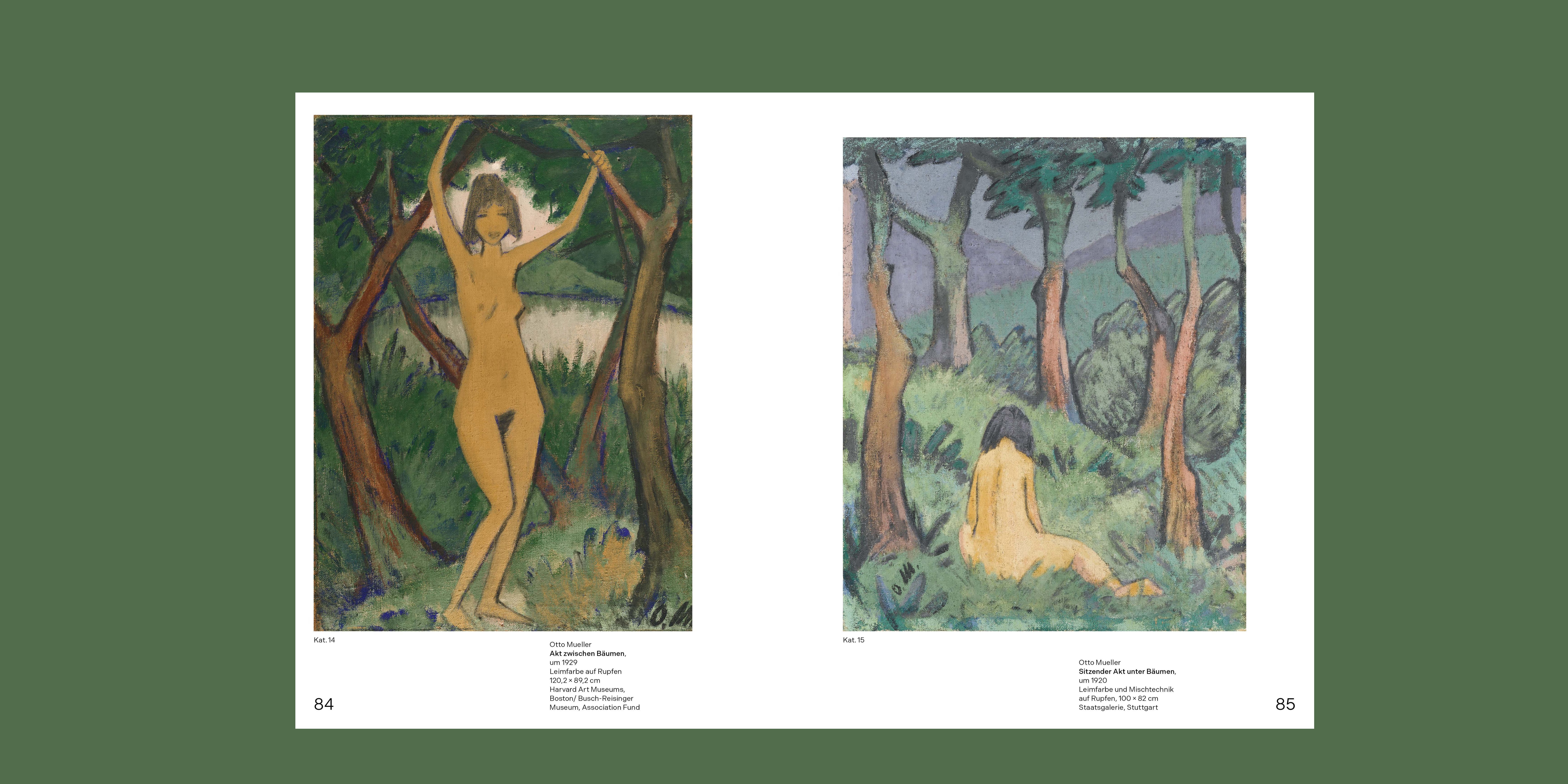 DIE SEHNSUCHT NACH DEM PARADIES Wie viele andere Künstler:innen der Moderne hatte Mueller Interesse an anderen Kulturen und sammelte außereuropäische Kunst. Neben dem Motiv der Badenden finden sich im Werk des Expressionisten Selbstbildnisse, Darstellungen von Masken, Holzschnitte sowie Wandmalereien. Auch Mueller war auf der Suche nach dem vermeintlich Ursprünglichen, das er im Einklang von Mensch und Natur zu finden glaubte, ebenso wie in einer Lebensweise, die dem bürgerlichen Leben, das er ablehnte, entgegenzustehen schien. Aber inwieweit bedient die Darstellung weiblicher Akte einen männlich sexualisierenden Blick? Welche Bedeutung hat Muellers Darstellung von Schwarzen Menschen und afrikanischen Masken? Wie gehen wir heute mit einer romantisierten Vorstellung von Sinti:zze und Rom:nja um, die sich in vielen seiner Werke wiederfindet? Benutzen wir seine originalen Werktitel, auch wenn wir sie heute als diskriminierend begreifen? In der Betrachtung der Kunst der Moderne nimmt der Katalog gegenwärtige Fragestellungen um Rassismus und Diskriminierung auf. Er eröffnet eine Möglichkeit, mit der Kunst nach Antworten auf diese Fragen zu suchen.