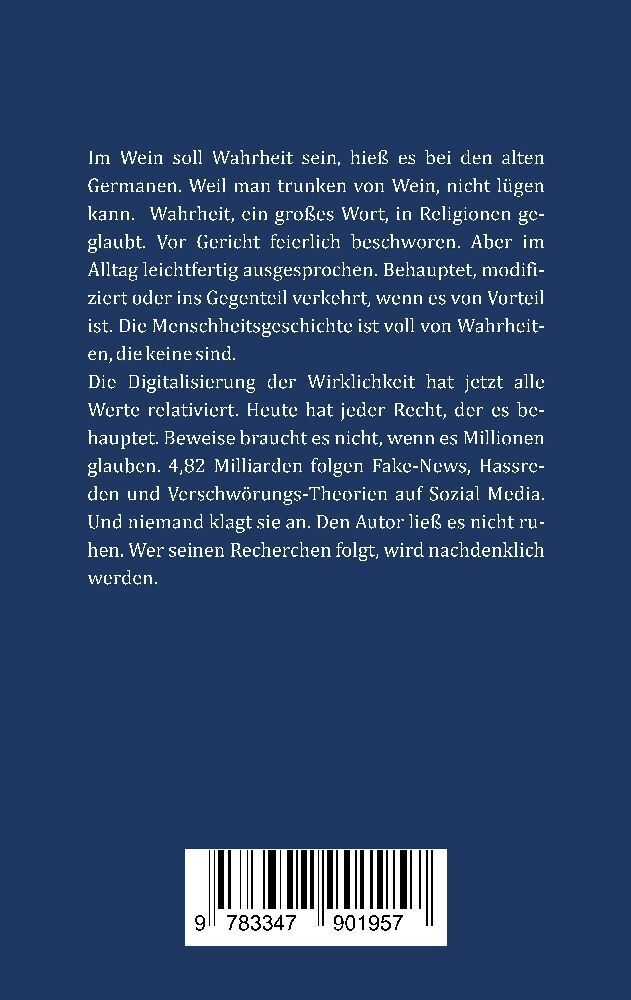 Im Wein soll Wahrheit sein, hieß es bei den alten Germanen. Weil man trunken von Wein, nicht lügen kann. Wahrheit, ein großes Wort, in Religionen geglaubt. Vor Gericht feierlich beschworen. Aber im Alltag leichtfertig ausgesprochen. Behauptet, modifiziert oder...