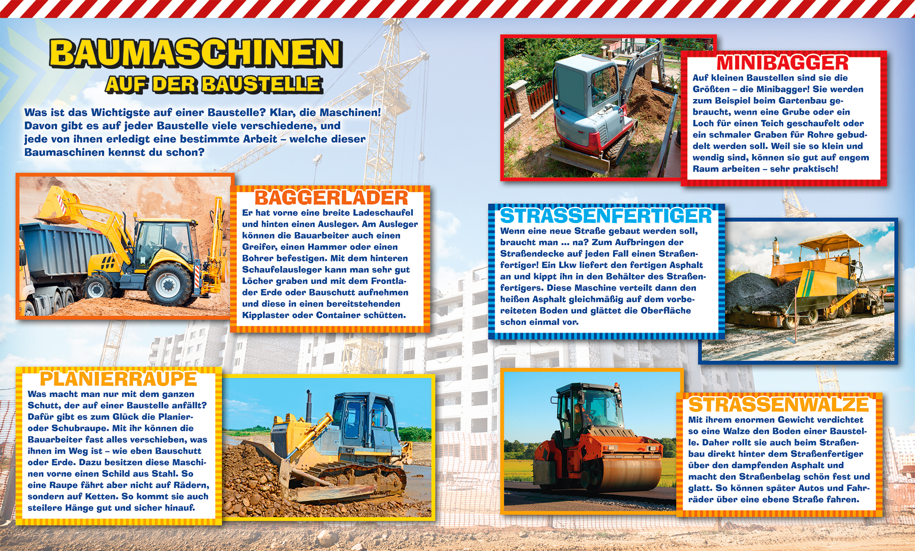 Auf die Baustelle, fertig, los! Dieses Erinnerungsalbum ist genau das Richtige für kleine Baustellenfans. Vollgepackt mit starken Abbildungen von Baustellenfahrzeugen und spannenden Infos über Kräne, Bagger und andere Baumaschinen bietet es genug Platz, dass s...