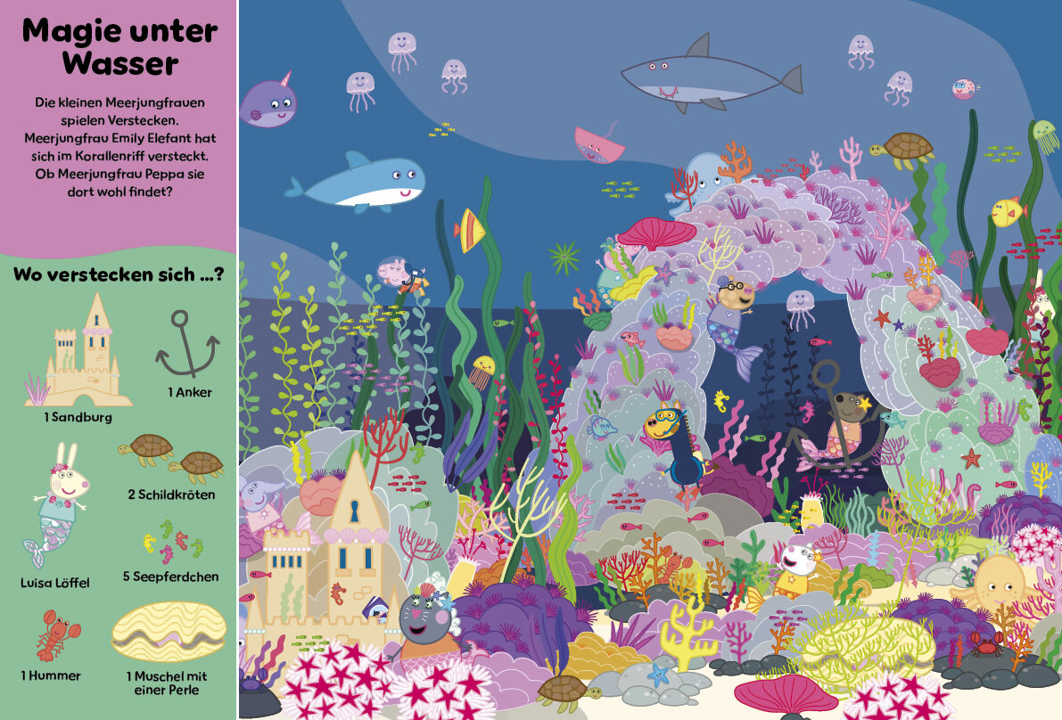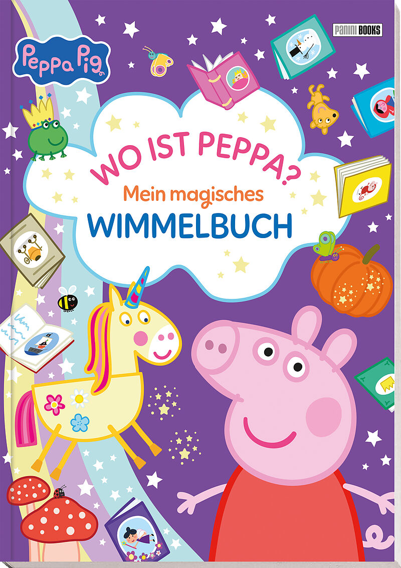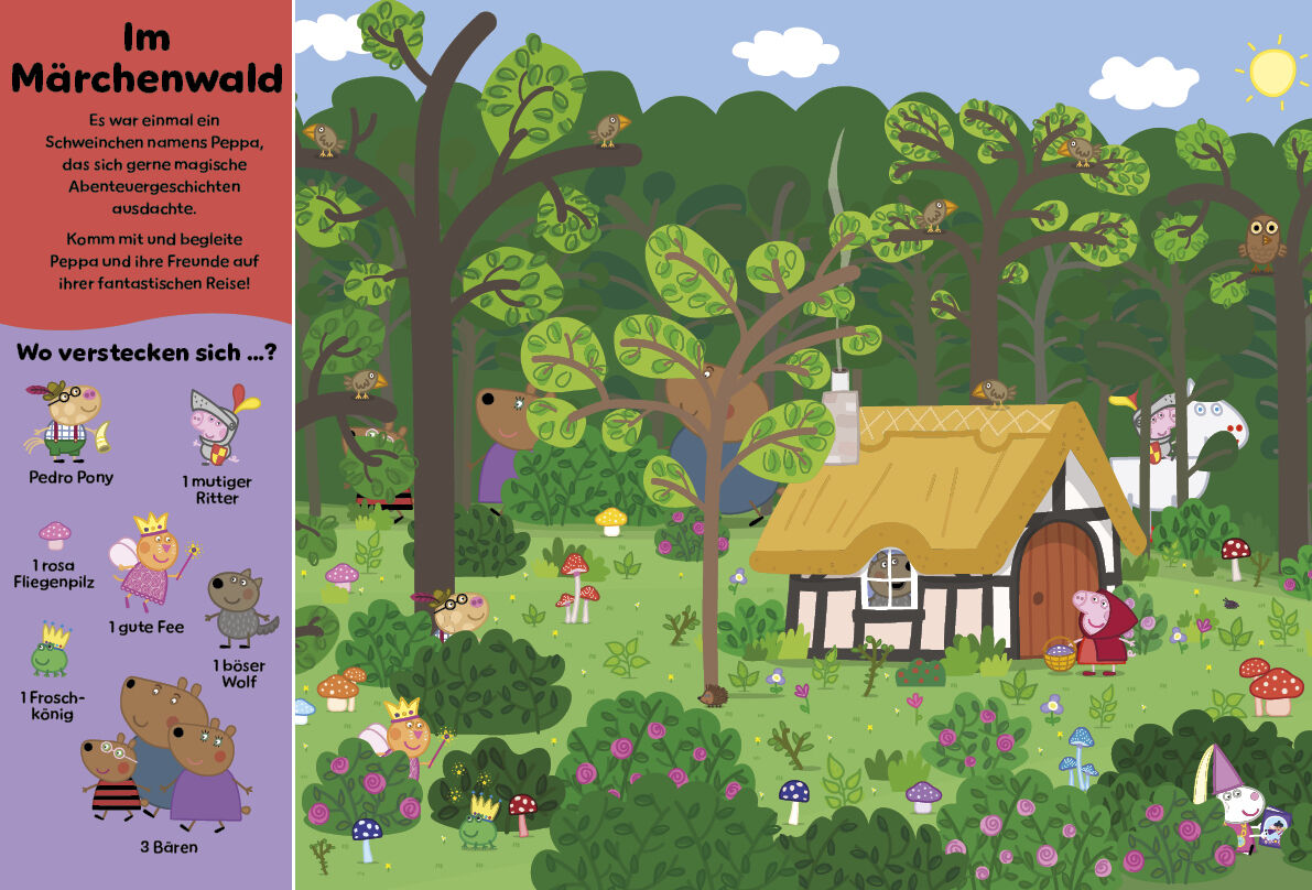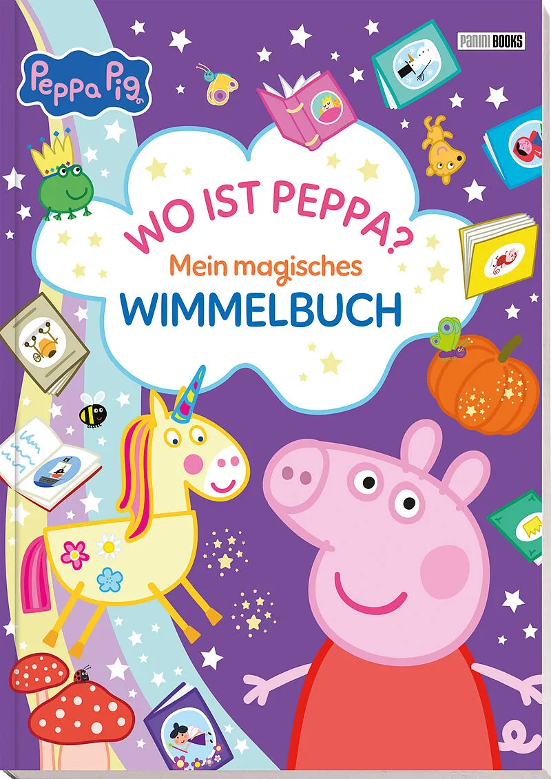Begleite Peppa und Schorsch bei einem magischen Wimmelabenteuer! Zwischen zauberhaften Feen, mächtigen Dinosauriern, Drachen und Einhörnern gibt es viele spannende Dinge zu entdecken. Aber wo steckt eigentlich Peppa? Findest du sie auf jeder Seite?