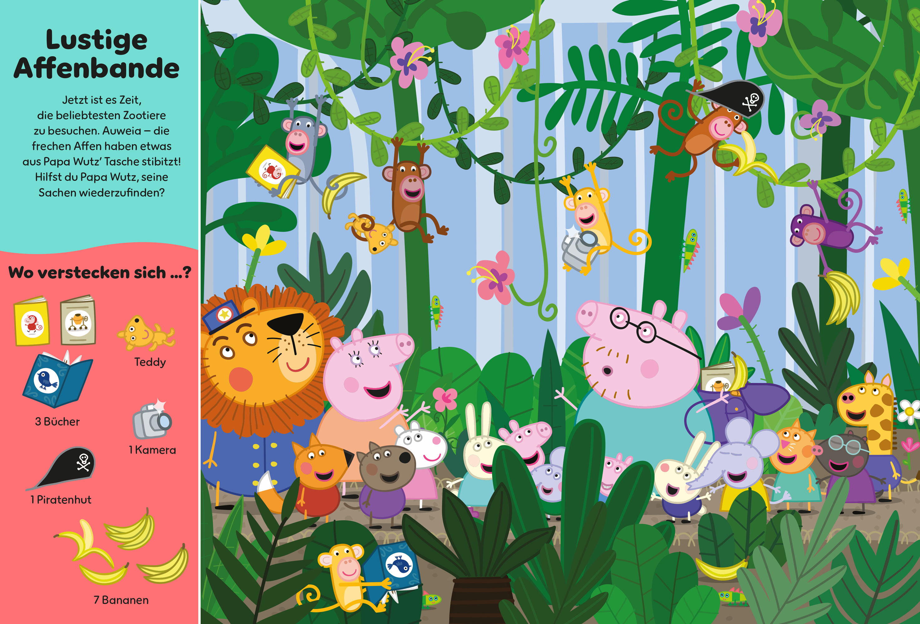 Begleite Peppa und ihre Familie bei einem tierischen Abenteuer im Zoo! Zwischen bunten Vögeln, lustigen Affen und coolen Pinguinen gibt es viele versteckte Dinge zu entdecken. Und wo steckt eigentlich Peppa? Kannst du sie auf jeder Seite finden?