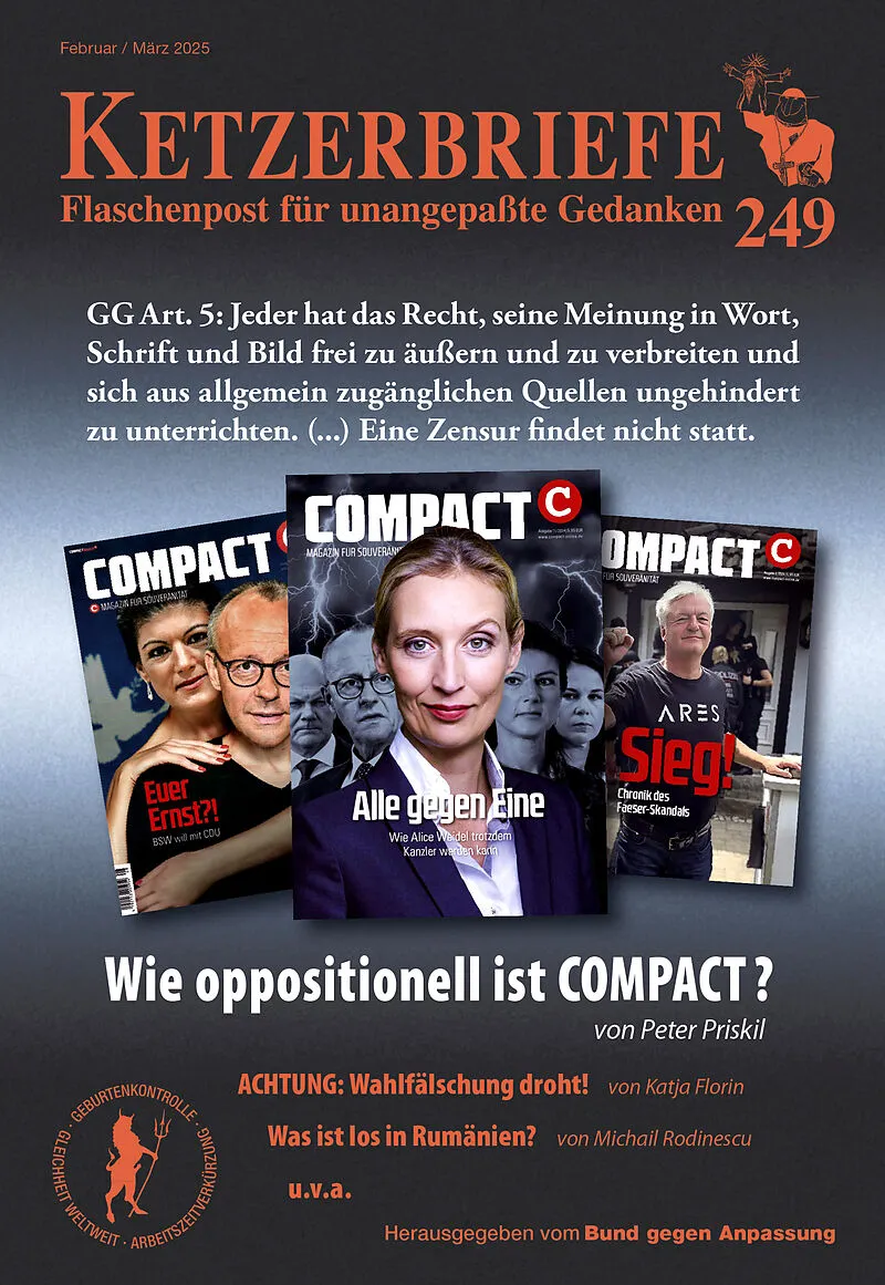 Inhalt Was ist los in Rumänien? von Michail Rodinescu Achtung: Wahlfälschung droht! von Katja Florin Zum Elon-Musk-Interview mit Alice Weidel von Kerstin Steinbach Wie oppositionell ist COMPACT? von Peter Priskil Leserzuschriften: Berichte aus dem Unrechtsstaa...