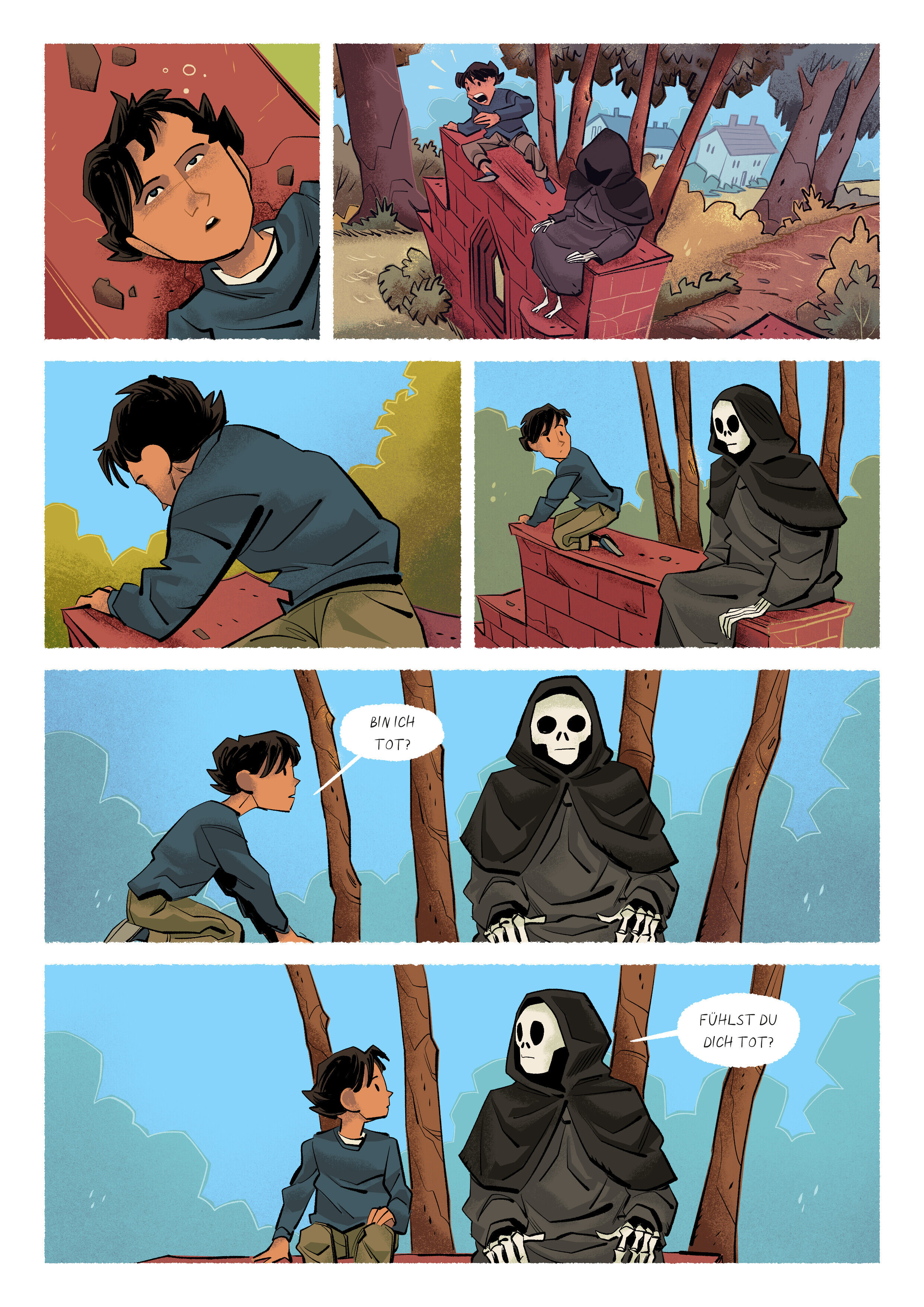 Das war knapp! Beim Herumklettern in der alten Klosterruine wäre Lukas beinahe abgestürzt. Er hätte sich den Hals brechen können! Das sieht der Tod offenbar ähnlich, denn er sitzt bereits neben Lukas: Kutte, Kapuze, Totenschädel, das volle Programm. Obwohl es ...