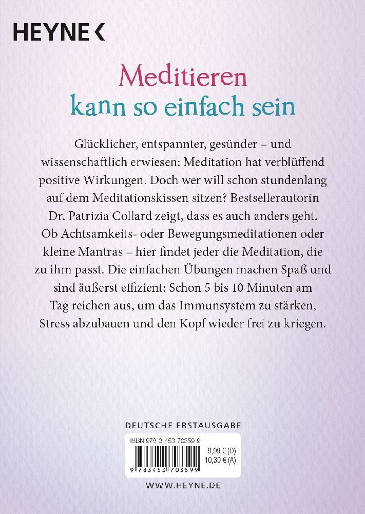 Glücklicher, entspannter, gesünder und wissenschaftlich erwiesen: Meditation hat verblüffend positive Wirkungen. Doch wer will schon stundenlang auf dem Meditationskissen sitzen? Bestsellerautorin Dr. Patrizia Collard zeigt, dass es auch anders geht. Ob Achtsa...