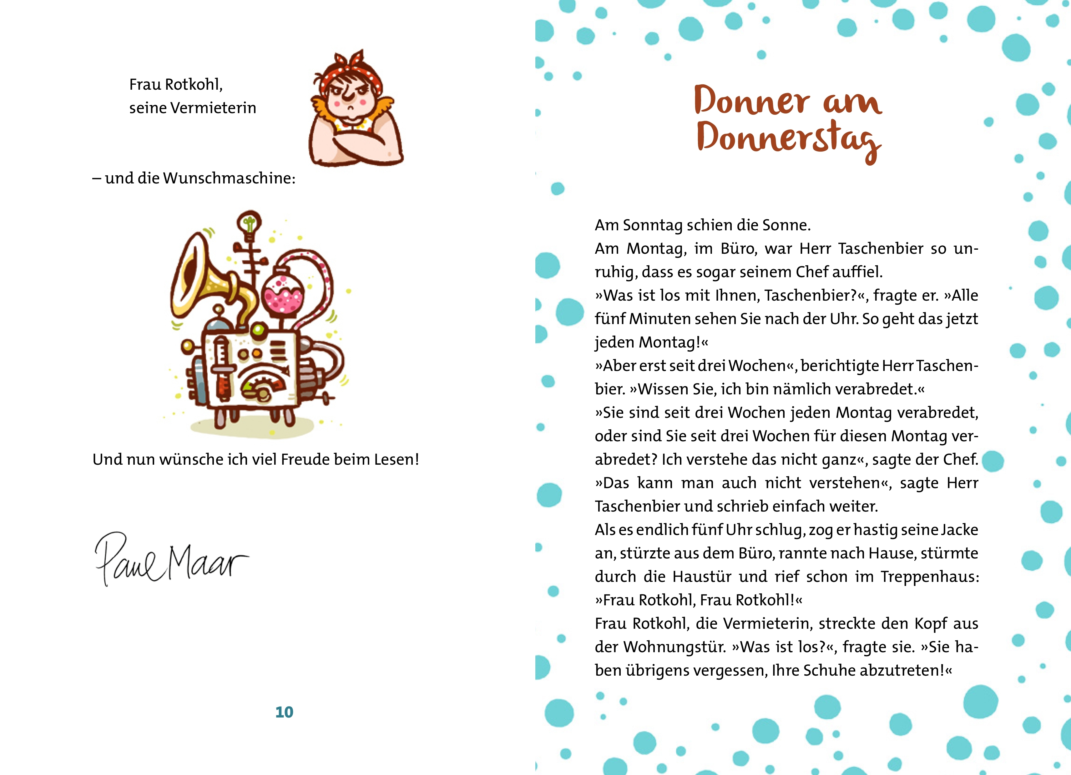 Herr Taschenbier tut alles, damit das Sams zu ihm zurückkommt. Er trifft am Montag Herrn Mon, am Dienstag geht er brav zum Dienst. Am Mittwoch ist zum Glück von ganz alleine Mitte der Woche, und am Donnerstag sorgt Herr Taschenbier höchstpersönlich mit Blech ...