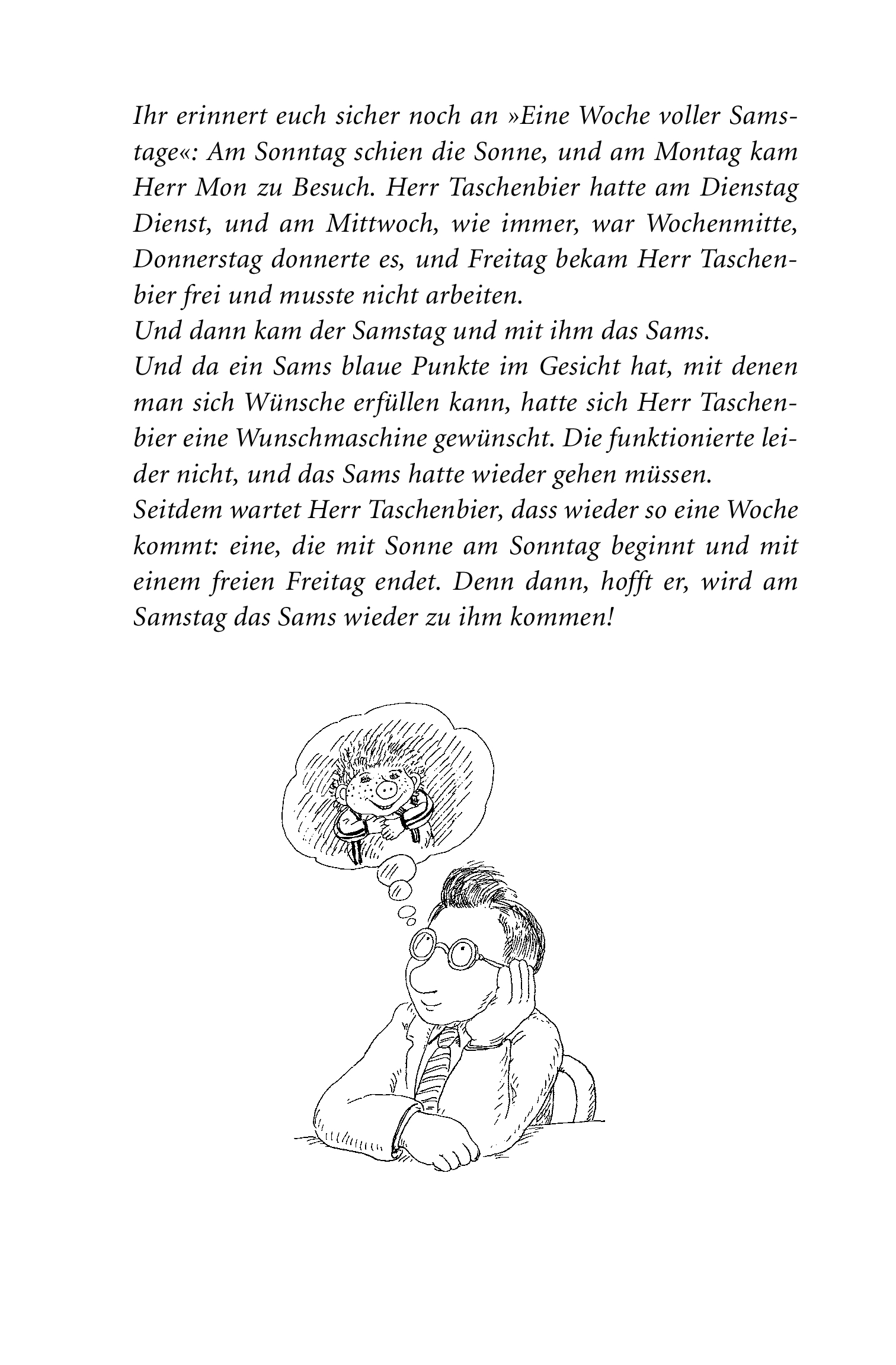 Weil am Sonntag die Sonne scheint, am Montag Herr Mon zu Besuch kommt, am Dienstag Dienst ist und am Mittwoch Wochenmitte, weil es am Donnerstag donnert und am Freitag frei gibt - deswegen, aber auch nur deswegen kommt am Samstag das Sams zurück, jenes kleine...