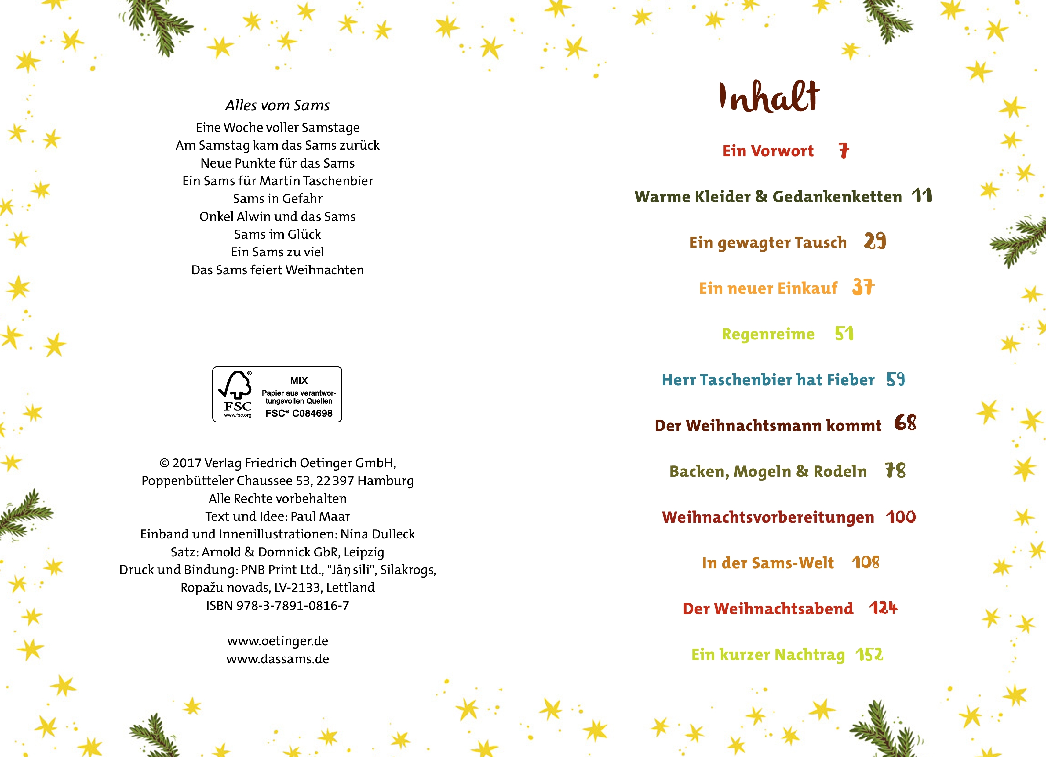 Weihnachten werden Wünsche wahr! So etwas hat das Sams noch nicht erlebt! Was sind das nur für Flügelwesen, die angeblich im Himmel wohnen? Wieso hat Papa Taschenbier auf einmal so viele Geheimnisse? Und warum stellt man sich Bäume ins Wohnzimmer? Als das Sam...