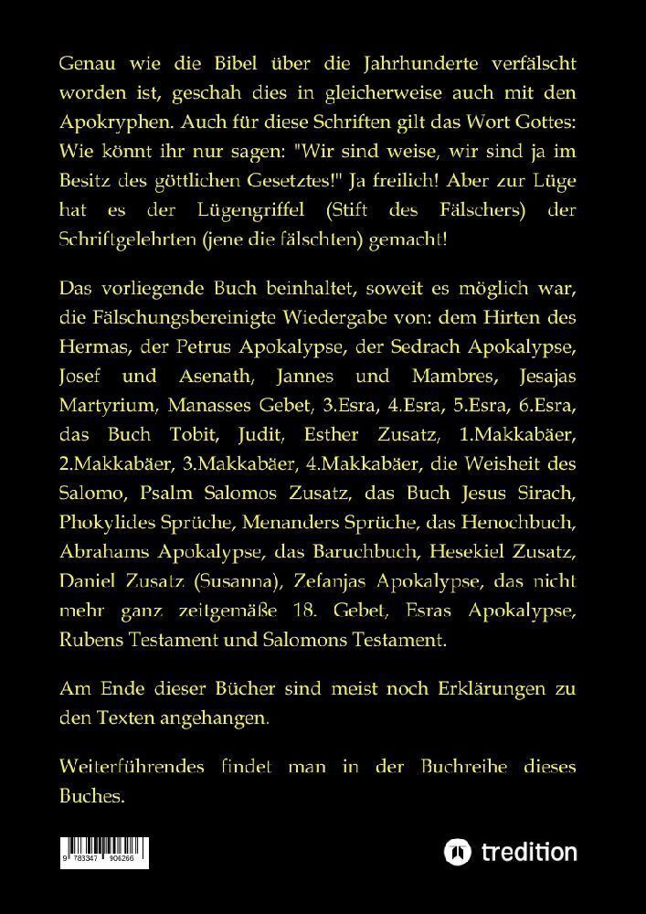 Genau wie die Bibel über die Jahrhunderte verfälscht worden, geschah dies auch mit den Apokryphen. Auch für diese Schriften gilt der Ausspruch Gottes: Wie könnt ihr nur sagen: »Wir sind weise, wir sind ja im Besitz des göttlichen Gesetzes!« Ja freilich! Aber z...