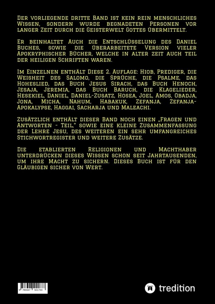 Der 3. Band ist kein rein menschliches Wissen, sondern wurde begnadeten Personen vor langer Zeit durch die Geisterwelt Gottes übermittelt. Er beinhaltet die Bücher: Hiob, Prediger, die Weisheit des Salomo, die Sprüche, die Psalme , das Hoheslied, das Buch Jesu...