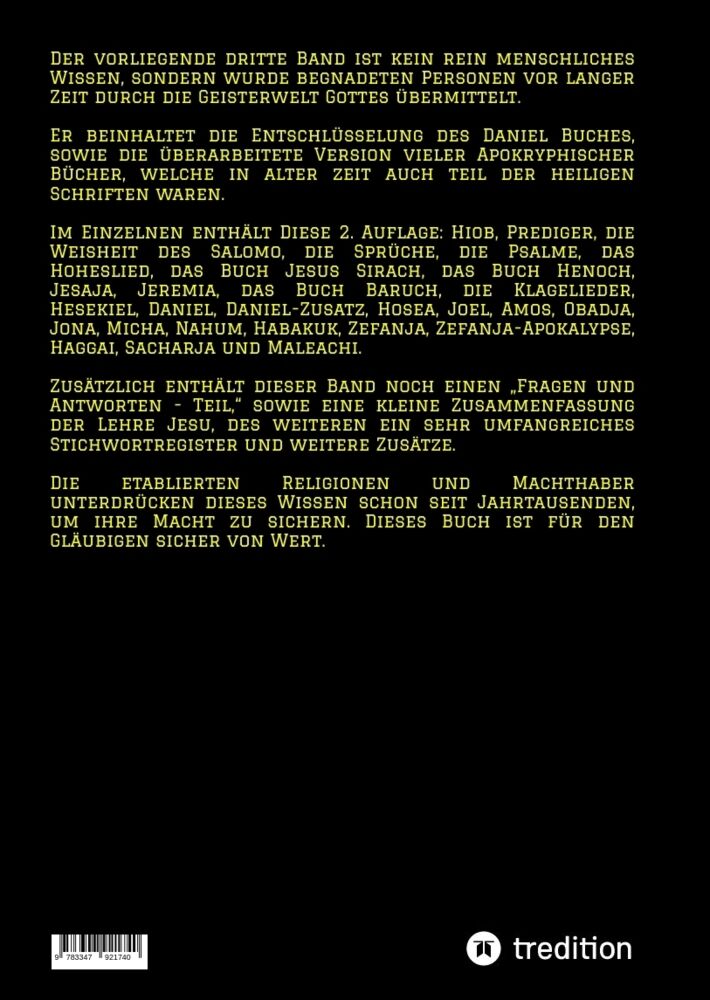 Der 3. Band ist kein rein menschliches Wissen, sondern wurde begnadeten Personen vor langer Zeit durch die Geisterwelt Gottes übermittelt. Er beinhaltet die Bücher: Hiob, Prediger, die Weisheit des Salomo, die Sprüche, die Psalme , das Hoheslied, das Buch Jesu...