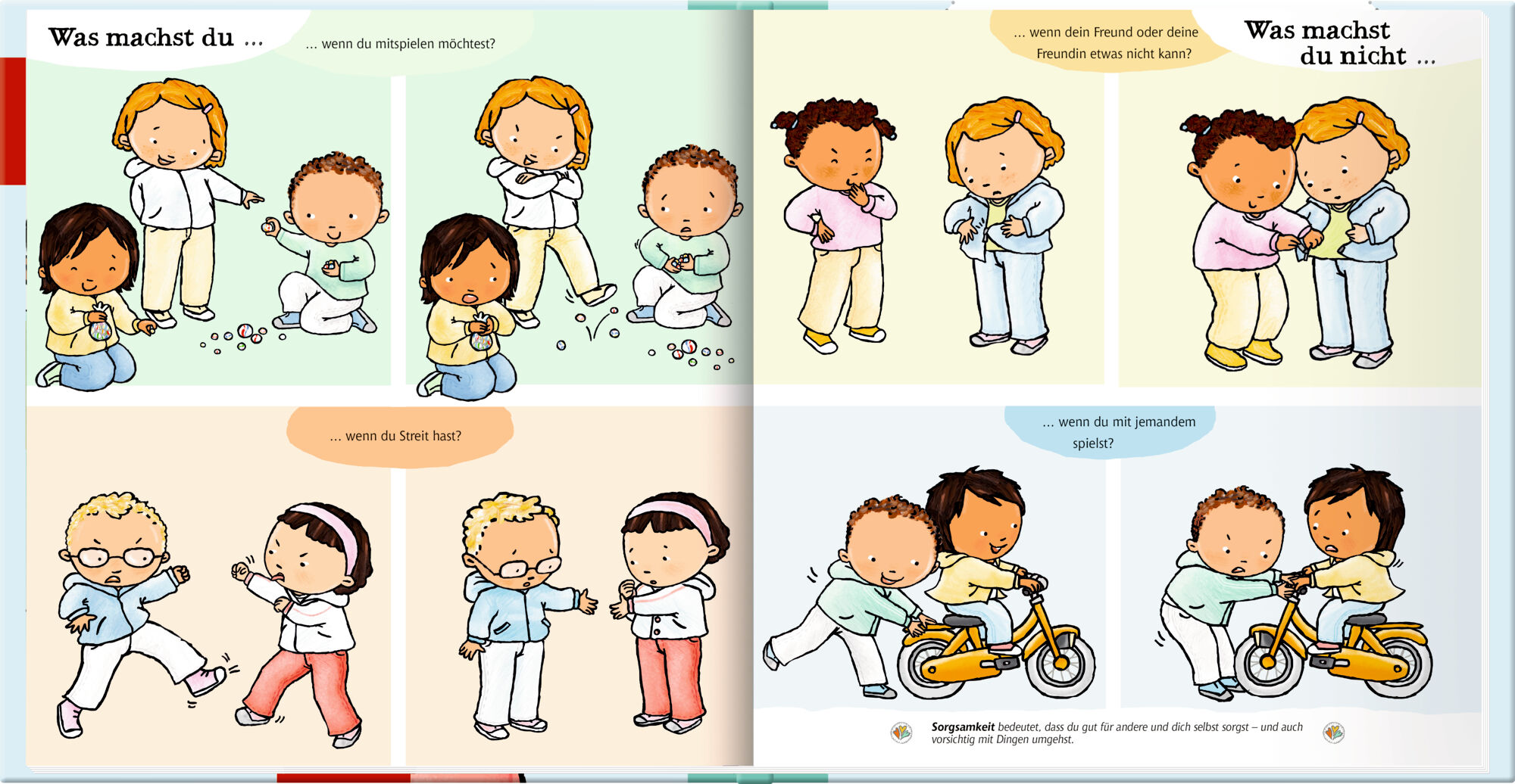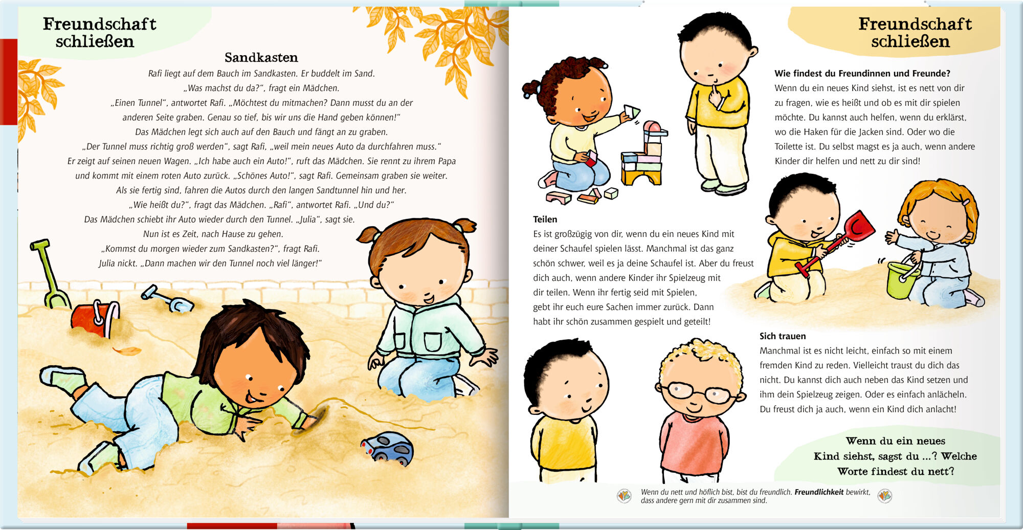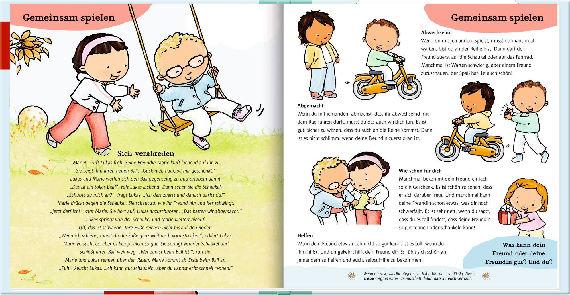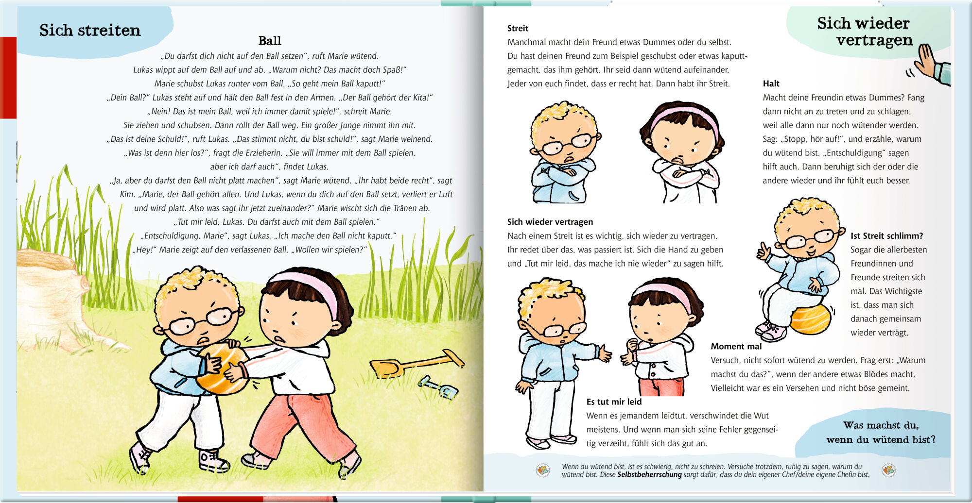 Marie und Lukas können sich nicht einigen, wer mit dem Ball spielen darf. Rafi möchte immer alles bestimmen. Und Hanna ärgert sich über ein fremdes Mädchen auf dem Spielplatz. Sich abzuwechseln, Spielzeug zu teilen, Kompromisse zu schließen was für Erwachsene...