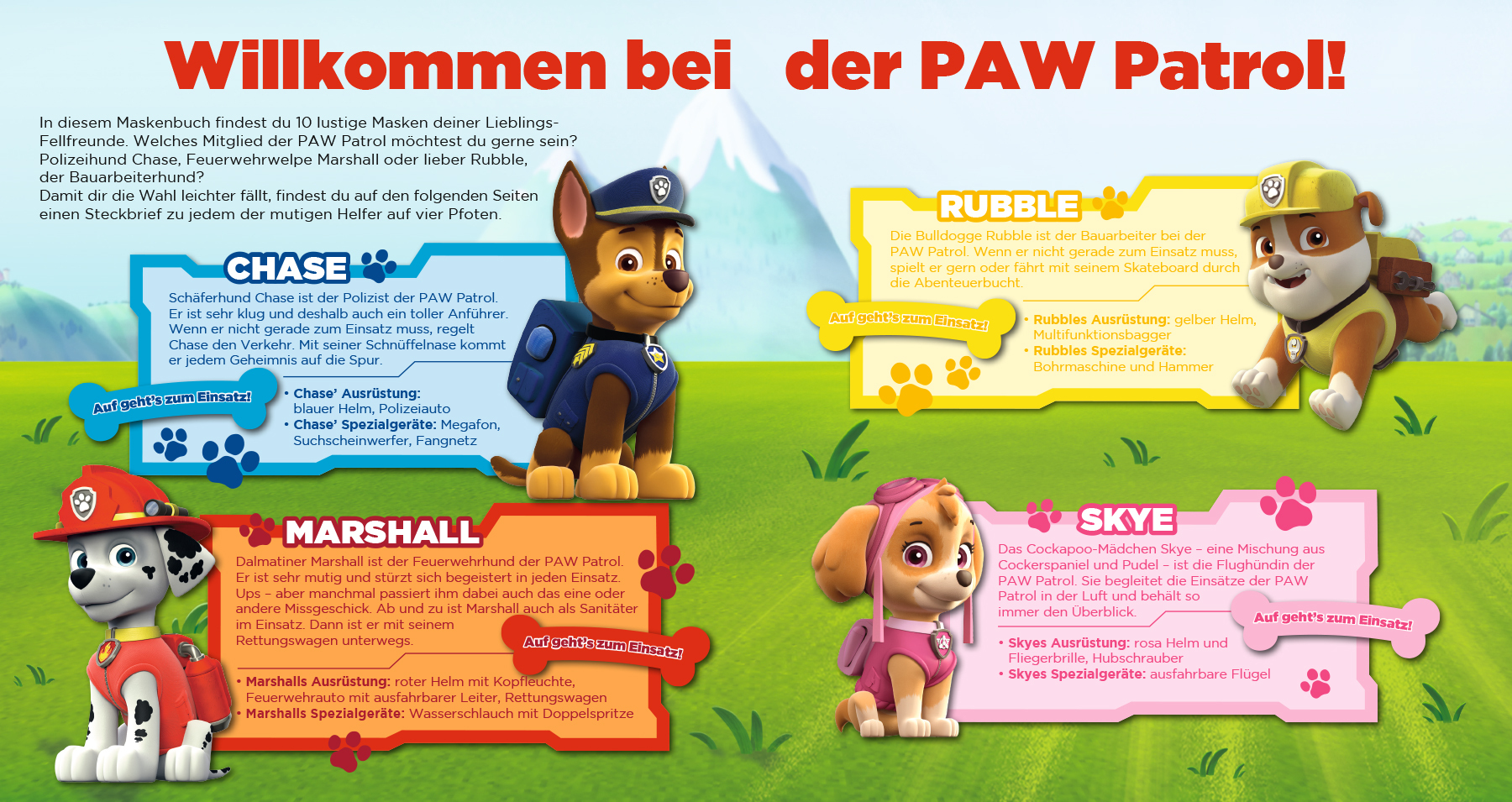 In diesem Buch findest du 10 lustige Masken deiner Fellfreunde! Ob Polizeihund Chase, Feuerwehrhund Marshall oder Rubble, der Bauarbeiterhund einfach die Vorlagen mithilfe eines Erwachsenen ausschneiden, an den Seiten Löcher hineinstechen und ein Gummiband dur...