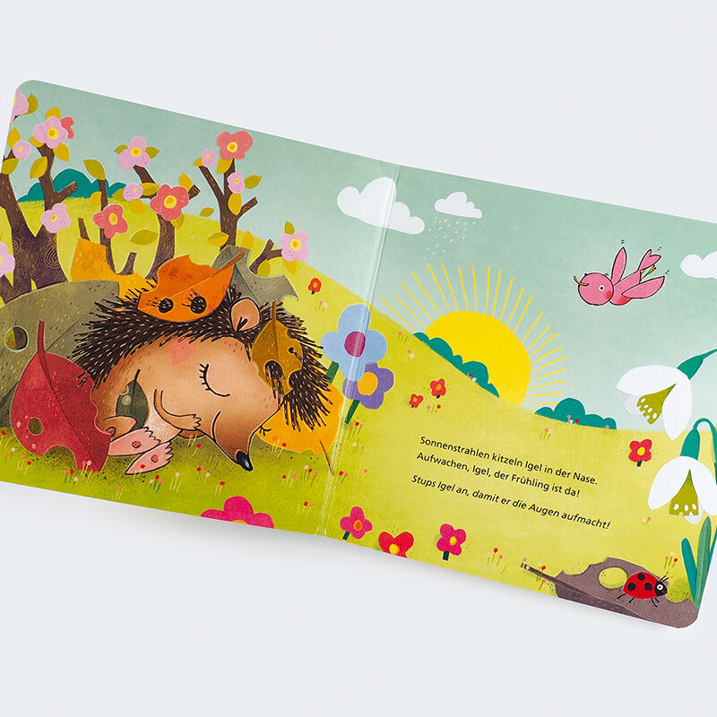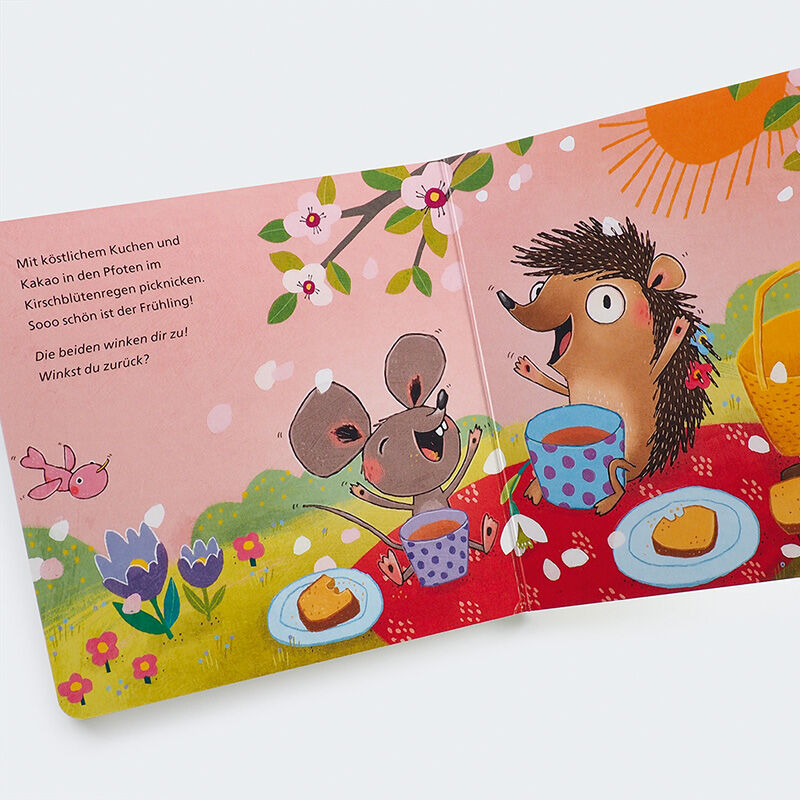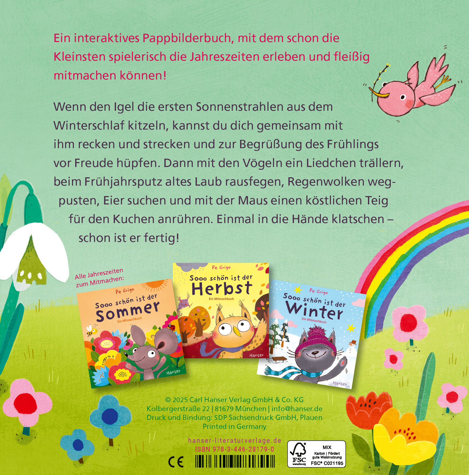 Klatschen, hüpfen und Regenwolken wegpusten mit Igel und Maus den Frühling erleben! Der dritte Band der Jahreszeiten-Reihe für Kinder ab 2 Jahren mit Illustrationen von Pe Grigo Eine interaktive, fröhliche und bunte Pappbilderbuch-Reihe, bei der Kinder die Jah...