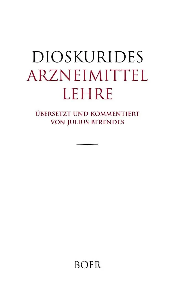 Die »materia medica« des Dioskurides umfaßt ca. 1000 Arzneimittel (813 pflanzlichen, 101 tierischen und 102 mineralischen Ursprungs) und bietet 4740 medizinische Anwendungen. Sie gliedert sich in fünf Bücher: 1. Aromatische Kräuter oder Gewürze, Öle, Salben; P...