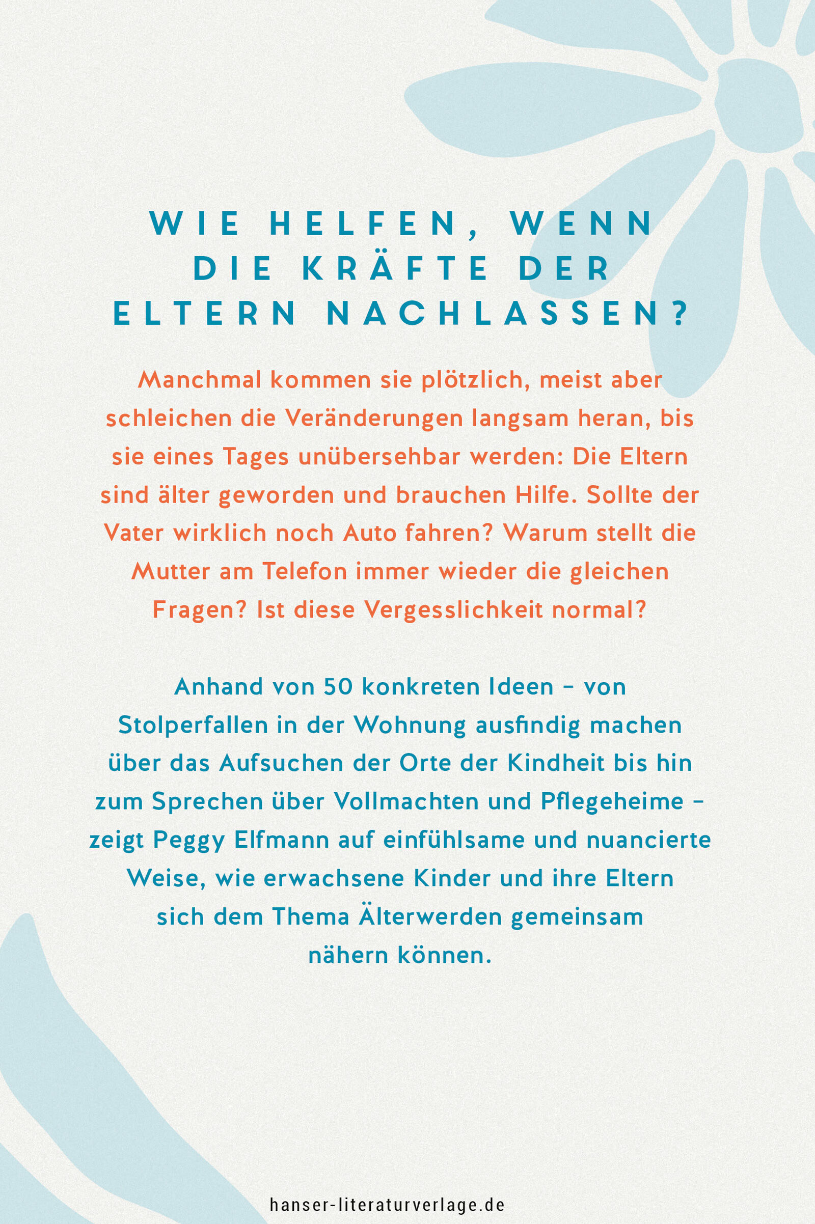 Wie helfen wir unseren Eltern, wenn ihre Kräfte nachlassen? Peggy Elfmann liefert Ideen, die sich am Alltag mit alternden Eltern orientieren für ein sensibles Miteinander Manchmal kommen sie plötzlich, meist aber schleichen die Veränderungen im Schneckentempo ...