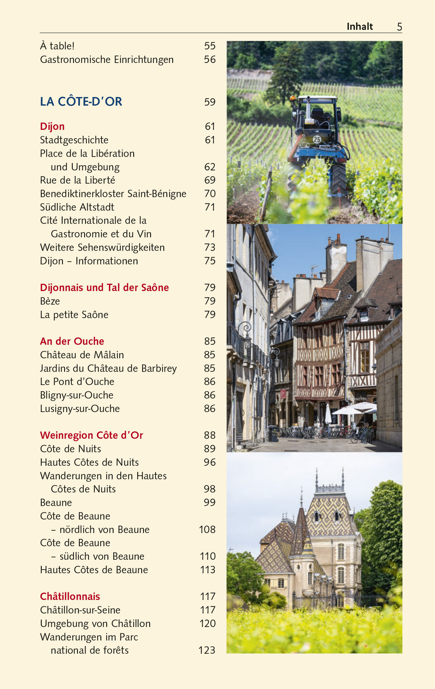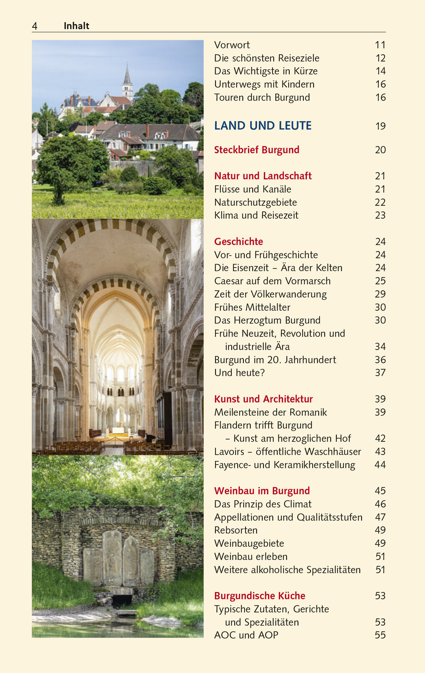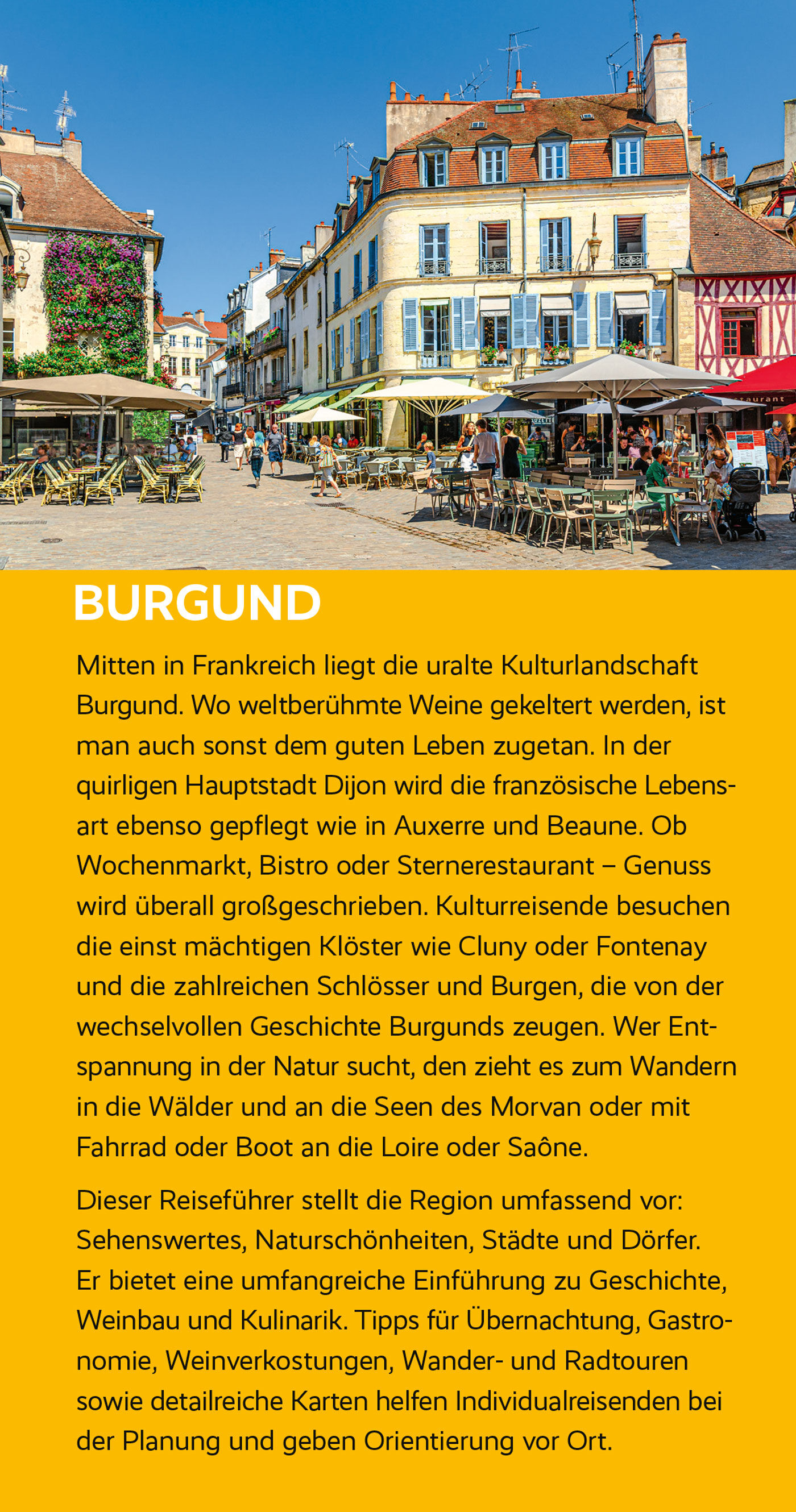 Kulturreisende besuchen die Abteien von Cluny und Fontenay, deren Orden im Mittelalter europaweit Klosterbauten und Geistesleben prägten ebenfalls Welterbestätten. Prächtige Renaissance- und Barockschlösser zeugen von Burgunds wechselvoller Geschichte. Postkartendörfchen wie Flavigny-sur-Ozerain oder Salmaise erzählen vom ländlichen Leben. Aktivurlauber kommen in den Wäldern und an den Seen des Morvan auf ihre Kosten, oder auch im Hausboot auf der Loire und Sâone. Und wer dabei die schönsten Herbergen, köstlichsten Gasthäuser und besten Weinkeller sucht, für den hat Autorin Peggy Leiverkus jede Menge Tipps im Gepäck.