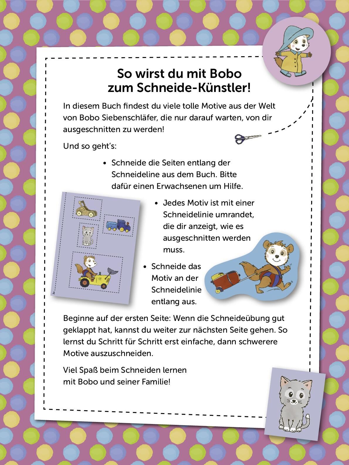 Seite für Seite mit Bobo Siebenschläfer zum Ausschneideprofi werden! • Bunt und fröhlich: Jeder der 37 Ausschneidebögen ist voll mit farbenfrohen Bildern von Bobo und seinen Freunden und seiner Familie. Figuren, Szenen und Motive ausschneiden und aufhäng...