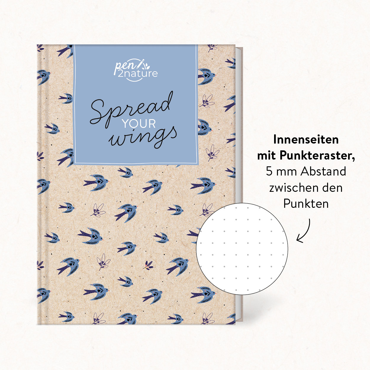 Spread Your Wings Nachhaltiges Notizbuch in A5 mit Hardcover und Vogel-Motiv