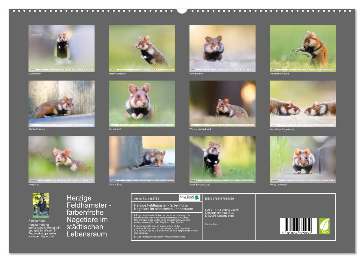 Die Naturfotografin Perdita Petzl begleitet seit mehreren Jahren die vom Aussterben bedrohten Europäischen Feldhamster in ihrem urbanen Lebensraum. Dabei sind eindrucksvolle Portraits von herausragender Qualität entstanden. Dieser liebevoll gestaltete Kalender...