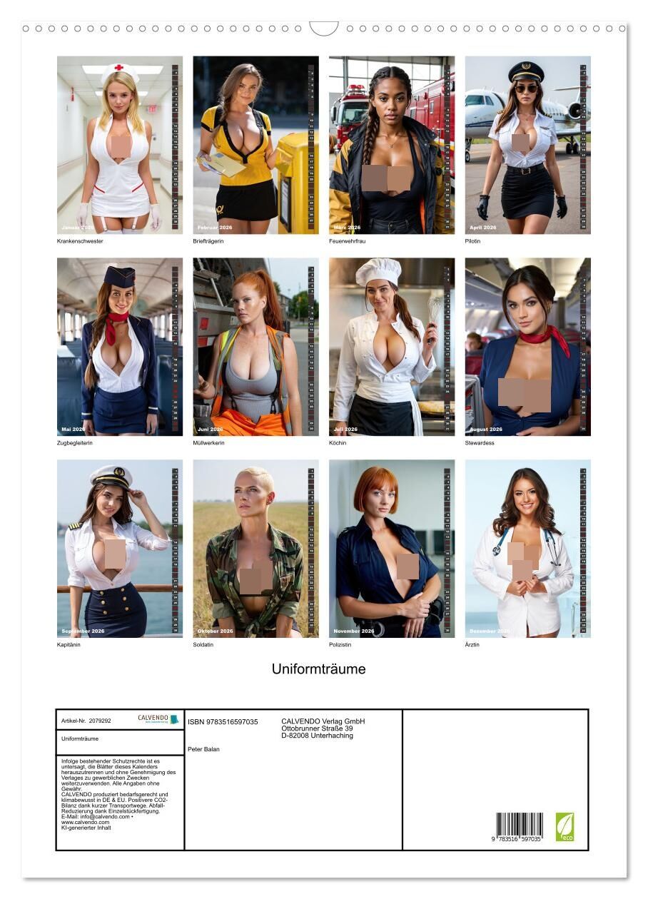 Zwölf sinnliche Frauen zeigen sich von ihrer verführerischsten Seite stark, selbstbewusst und freizügig in typischen Berufsuniformen. Ob Ärztin, Feuerwehrfrau oder Müllwerkerin: Jede Szene inszeniert Kurven, Charakter und Leidenschaft mit einem Augenzwinkern. ...