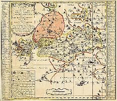 REPRINT - Außenformat (Breite x Höhe) 56 x 48 cm | Darstellungsgröße (Breite x Höhe) 54 x 46 cm. Die Karte wird gerollt - in einer stabilen Papphülse - geliefert. KARTUSCHENINSCHRIFT: Ammt Langensalza, Erbschaft Treffurt, Voictey Dorla, Ammte Ebeleben, Stadt Mühlhausen 1757 Accurate Geographische Delineation des zu dem Chursaechsischen Thüringen gehörigen Ammtes Langensalza. Nebst der Gahn Erbschaft Treffurth, Voistey Dorla und dem Fürstl. Schwarzburger Ammte Ebeleben. Ingel: Schernberg und der Freyen Reichsstadt Mühlhausen 1754 Oben links befindet sich die Titelkartusche. Links und rechts neben der Karte befindet sich das Suchregister (z.B. Lauch D.E.d). Unten links die genauen Erklärungen. Nach dem 30. jährigen Krieg bekam die neu gegründete Linie der Herzöge von Sachsen Weißenfels die Herrschaft in Langensalza. Nach dem Tod von Herzog Adolph II. im Jahre 1746 übernahm seine Frau Friederike von 1746 bis 1775 die Herrschaft auf dem Langensalzaer Schloß Dryburg. In jenen Jahren hatte das Amt Langensalza seine größte Ausdehnung erlangt und im Rahmen der vielen Kleinstaaten keinen unbedeutenden Namen. Was gerade einem Niederländer bewog, eine der schönsten Karten des damaligen Amtes Langensalza, der Reichsstadt Mühlhausen. zu schaffen, wurde nicht überliefert. Interessant ist aber die Geschichte des Schöpfers jener farbigen Karte. Der Kupferstecher und Kartenverleger Petrus Schenck (auch Pieter, Peter) wurde 1660 in Elberfeld geboren. Er wurde Schüler von G. Valck. Mit diesem Zusammen kaufte er (damals 23 jährig) im Jahr 1683 alle Platten der Firma Blaeu. Bis er 1718 in Amsterdam starb, gab er zahlreiche Karten heraus. Sein Sohn Peter wurde 1698 geboren und setzte das Erbe seines Vaters fort. Von ihm stammt auch die vorliegende Karte aus dem Jahr 1754: "... Amt Langensalza, nebst der Gahn Erbschaft Treffurth, Voigtey Dorla und dem Fürstlichen Schwarzburgischen Ammte Ebeleben... und der Reichsstadt Mühlhausen... " Hergestellt wurde Sie in den Niederlanden. Peter Schenck hatte 2 Jahre vor der Herausgabe unserer Karte mit der Veröffentlichung des "Atlas saxoniae" im Jahre 1752, das später als "Schenckscher Atlas" in die Geschichte ein ging, sein bekanntestes Werk geschaffen. Er war 1754 bereits einer der berühmten Kartographen. ORTSCHAFTEN AUF DER KARTE - Teil 1: --- Amt Langensalza Creutzburg Mühla ( Mihla ), Ebenhaussen - ( Ebenhausen ), Franckenroda ( Frankenroda ), Cella, Schnellmannshausen, Scherbta ( Scherbda ), Falcken ( Falken ), Treffurth ( Treddurt ), Schonberg - ( Schönberg ), Taubenthal, Naza ( Nazza ), Yberg, Rambach, Großen Burschla ( Großburschla ), Weißenborn, Volckershausen ( Völkershausen ), Töpfer Wendehaußen ( Wendehausen ), Schierswende - ( Schierschwende ), Armsburg, Wannfrid ( Wanfried ), Alten Burschla ( Altenburschla ), Halungen ( Hallungen ), Heinroda ( Heyerode ), Vorwerg Karnberg, Diedorff ( Diedorf ), Cathrinberg (Katahrinenberg ), Vorwerg Scharffel, Loh, Gahn, Grumbach, Henningsleben, Zimmern, Ober Golcke, Mittel Gocke, UnterGolcke, Vorwerg Thiemsburg - ( Thiemsburg ), Aldstädt - ( Alterstädt ), Waldstädt oder St. Julian, Uffhofen ( Ufhoven ), Weberstädt ( Webestedt ), Mülverstädt (Mülverstedt ), Schönstädt ( Schönstedt ), Alten Gottern - ( Altengottern ), Billeben, Blanckenburg, Botenheilingen ( Bothenheilingen ), Cammer Forst - (Kammerforst ), Ebeleben, Flarchheim, Freyen Bessingen - ( Freienbessingen ), Großen Burschla ( Großburschla ), Großen Welßbach ( Großwelsbach ), Großen Gottern - ( Großengottern ), Groß Uhrleben ( Urleben ), Hauß Sömmern ( Haussömmern ), Heldra, Heroldshaußen - ( Heroldishausen ), Holz Süßra - ( Holzsußra ), Horn Sömmern - ( Hornsömmern ), Isersheiligen ( Issersheilingen ), Kirchheilingen, Klein Uhrleben ( Urleben ), Klein Vargula ( Kleinvargula ), Klein Welßbach - (Kleinwelsbach), Klettstädt ( Klettstedt ), Langula, Marck Süßra - ( Marksußra ), Marolderode ( Marolterode ), Mercksleben ( Merxleben ), Mittel Sömmern - ) Mittelsömmern ), Nieder Dorla ( Niederdorla ), Neuenheilingen (Neunheilingen ), Ober Dorla ( Oberdorla ), Ober Nielstädt ( Nägelstedt ), Oppershausen, Schnellmannshaußen ( Schnellmannshausen ), Schönstedter Vitz, Seebach, Sundhaußen ( Sundhausen ), Taennstädt ( Tennstedt ), Thambsbrück ( Thamsbrück ), Tottleben, Unter Nielstädt - ( Nägelstedt ), Vorwerg Schonberg, Vorwerg Taubenthal, Wendehaußen - ( Wendehausen ), Zaunroden -- Mühlen Bruchmühl, Brückmühl, Dorffmühl, Freudenthalmühl, Gelbrödermühl, Grundmuhl, Henningsleber Windmühle, Hintermühl, Klipmühl, Kraynmühl, Kriegsmühl, Lohmühl, Marcksmühl, Mittelmühl, Neumühl, Obermühl, Oelmühl, Probstmühl, Pulvermühl, Rosenmühl, Riethmühl, Ringmühl, Schambachsmühl, Stimsmühl, Teichmühl, Untermühl, Vodermühl, Walckmühl, Wiesenmühl, Wickelmühl, -- Bauwerke Vorwerg Böhmen, Engelsbrück, Försterhauß, Göldne Krone, Grentz Hauß, Hoßpital, Hoßpital Sct. Andrae, Ihlefeld, Klein Uhrleber Kirche, Nordmannstein (Schloß), Reckenbiehl ( Reckenbühl ), Saltzbrücke, Siechhoff, Wartte Henningsleben, Wartte Waldstädter, Wartte Zaunröder, Wormsche Guth, -- Wüstemarcken Appenheilingen, Bechstädt, Bütthaußen, Hinter Scherbta, Lingel, Lippershaußen, Naundorff, Nieder Heroldhaußen, Nieder Seebach, Ottenheiligen, Tünchhaußen, Wenigen Tännstädt, Wünschheiligen, Erhebungen Armsburg, Das Horn, Iberg, Osterberg, Rangenhügel, Rotheberg, Steinerne Mann, Sandberg, Weichberg, Wartthügel, Weinberg, - Gewässer Benne Bach, Breiten Born, Bruch Born, Dorff Bach, Ferne Bach, Gelbröder Bach, Hanff See, Hennigsleber Bach, Hesel Bach, Kaijnsprung, Keßel Born, Kleine Golcke, Mittel Golcke, Mühl Teich, Ober Golcke, Oede Bach, Saltza, Schmerlings Bach, Schnellmanshaüser Bach, Schönstädter Bach, Seltenrein, Singel Bach, Träncke Bach, Unstruth Fluß, Welz Bach, Werre Fluß, Orte außerhalb Amt Langensalza Eisenach, Fischbach, Eichroda, Wuth ( Wutha-Farnroda ), Riechhorn, Schön